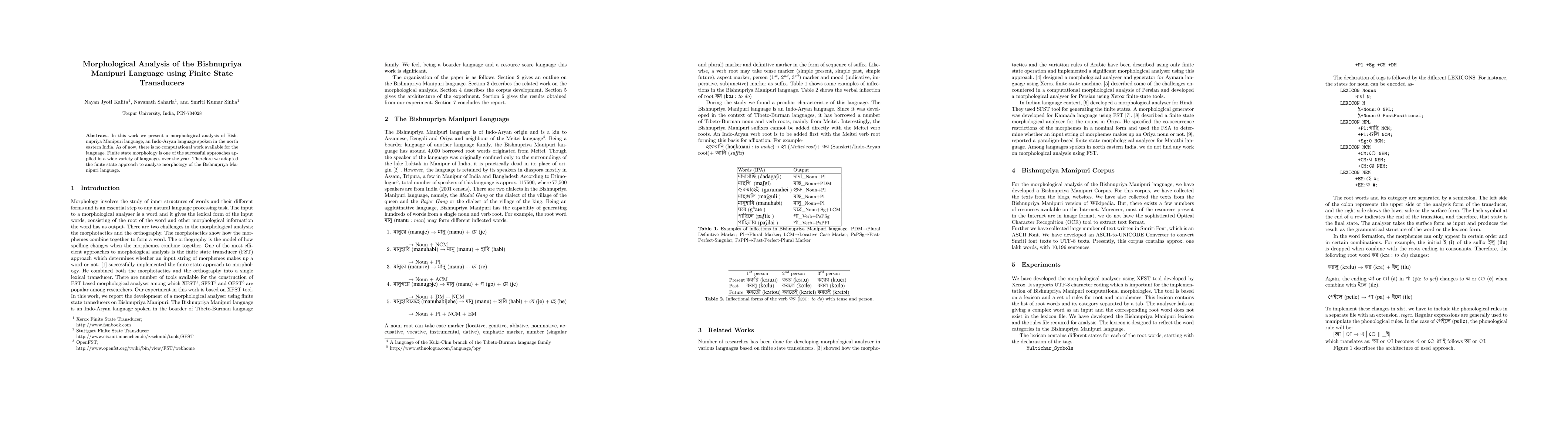 In this work we present a morphological analysis of Bishnupriya Manipuri language, an Indo-Aryan language spoken in the north eastern India. As of now, there is no computational work available for the language. Finite state morphology is one of the successful approaches applied in a wide variety of languages over the year. Therefore we adapted the finite state approach to analyse morphology of the Bishnupriya Manipuri language.