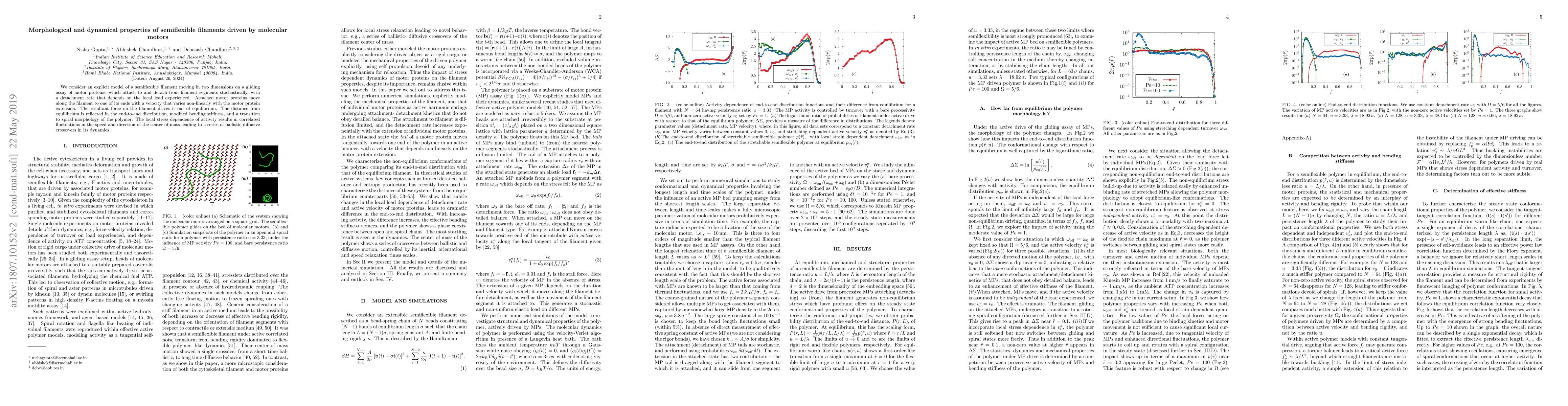 This paper models semiflexible filaments driven by stochastically attaching and detaching molecular motors, showing how varying motor protein extension affects filament dynamics. The study reveals a transition to spiral morphology and correlated fluctuations in the center of mass, leading to a series of ballistic-diffusive crossovers.