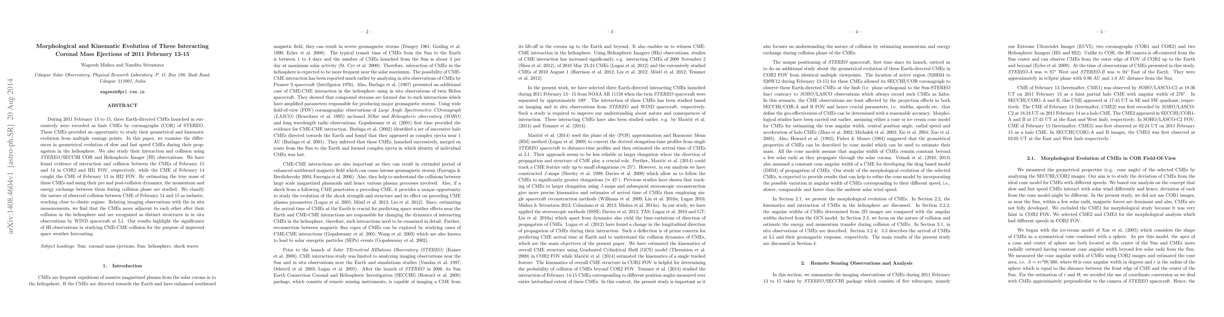 During 2011 February 13 to 15, three Earth-directed CMEs launched in successively were recorded as limb CMEs by coronagraphs (COR) of STEREO. These CMEs provided an opportunity to study their geometrical and kinematic evolution from multiple vantage points. In this paper, we examine the differences in geometrical evolution of slow and fast speed CMEs during their propagation in the heliosphere. We also study their interaction and collision using STEREO/SECCHI COR and Heliospheric Imager (HI) observations. We have found evidence of interaction and collision between the CMEs of February 15 and 14 in COR2 and HI1 FOV, respectively, while the CME of February 14 caught the CME of February 13 in HI2 FOV. By estimating the true mass of these CMEs and using their pre and post-collision dynamics, the momentum and energy exchange between them during collision phase are studied. We classify the nature of observed collision between CME of February 14 and 15 as inelastic, reaching close to elastic regime. Relating imaging observations with the in situ measurements, we find that the CMEs move adjacent to each other after their collision in the heliosphere and are recognized as distinct structures in in situ observations by WIND spacecraft at L1. Our results highlight the significance of HI observations in studying CME-CME collision for the purpose of improved space weather forecasting.