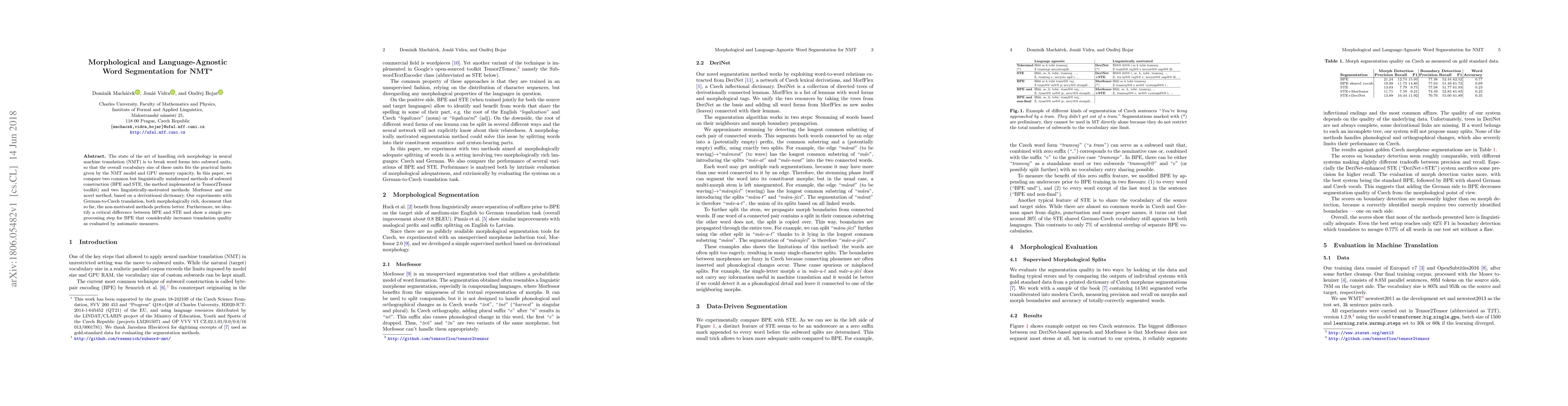 This paper compares subword segmentation methods for neural machine translation, finding that non-linguistically motivated methods like BPE and STE outperform linguistically motivated approaches like Morfessor and a novel derivational dictionary-based method in morphologically rich German-to-Czech translation tasks. A simple pre-processing step for BPE improves its translation quality.