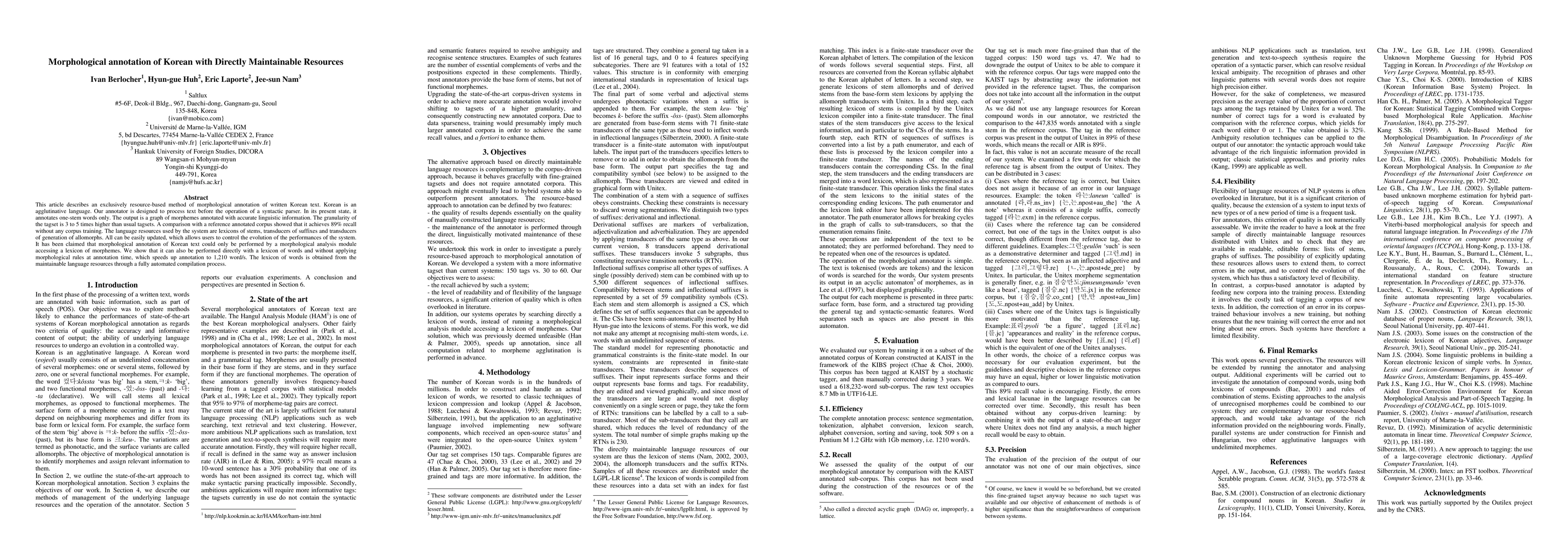 This paper presents a resource-based method for morphologically annotating Korean text using directly maintainable lexicons, achieving 89% recall without corpus training. The annotator processes one-stem words, producing a detailed graph of morphemes, and operates independently of syntactic parsing.