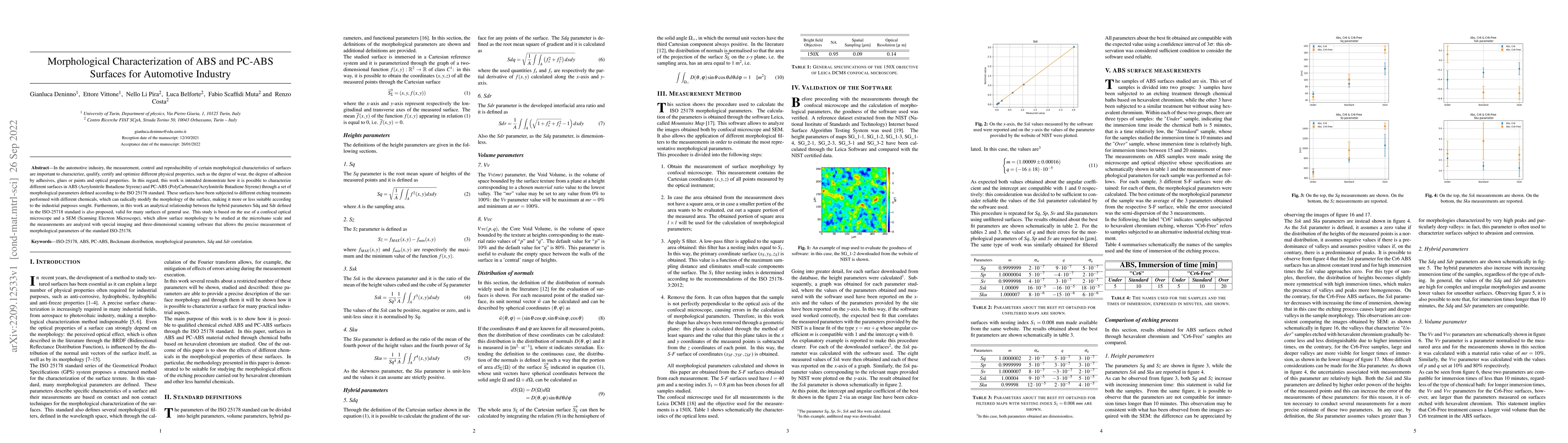 This research characterizes the morphological surfaces of ABS and PC-ABS materials used in the automotive industry, employing confocal microscopy and SEM to analyze the effects of various etching treatments on surface morphology. It also proposes an analytical relationship between Sdq and Sdr parameters, enhancing the understanding of surface suitability for industrial applications.