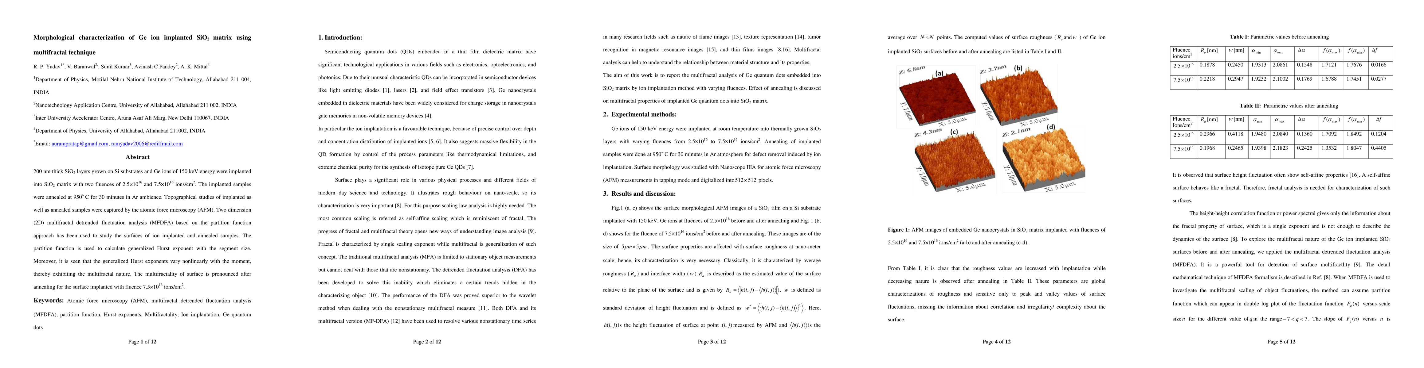 200 nm thick SiO2 layers grown on Si substrates and Ge ions of 150 keV energy were implanted into SiO2 matrix with Different fluences. The implanted samples were annealed at 950 C for 30 minutes in Ar ambience. Topographical studies of implanted as well as annealed samples were captured by the atomic force microscopy (AFM). Two dimension (2D) multifractal detrended fluctuation analysis (MFDFA) based on the partition function approach has been used to study the surfaces of ion implanted and annealed samples. The partition function is used to calculate generalized Hurst exponent with the segment size. Moreover, it is seen that the generalized Hurst exponents vary nonlinearly with the moment, thereby exhibiting the multifractal nature. The multifractality of surface is pronounced after annealing for the surface implanted with fluence 7.5X1016 ions/cm^2.