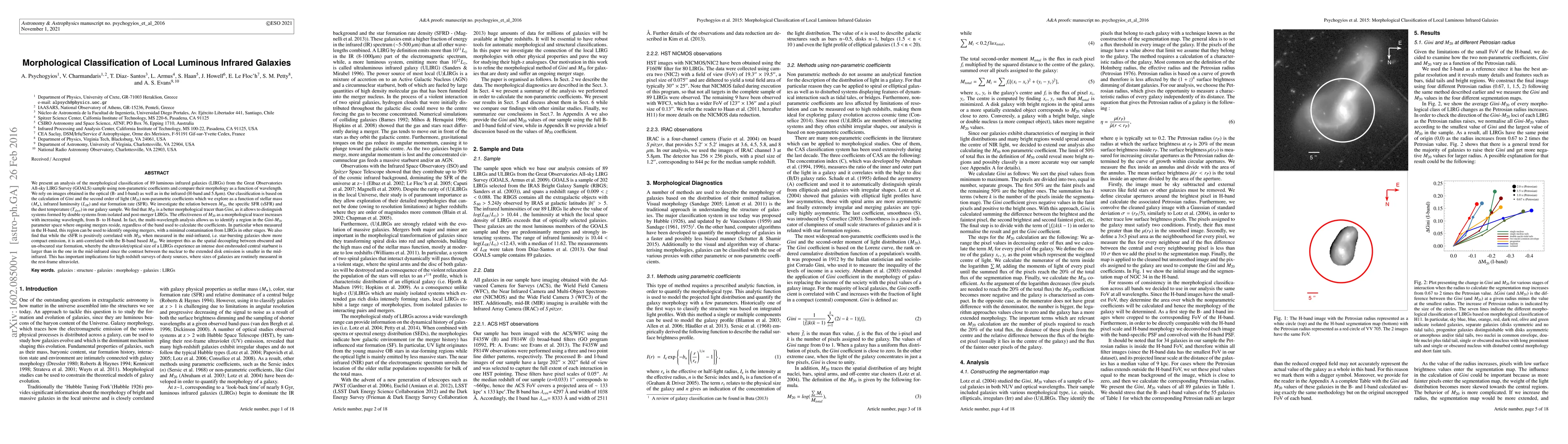 We present an analysis of the morphological classification of 89 luminous infrared galaxies (LIRGs) from the Great Observatories All-sky LIRG Survey (GOALS) sample using non-parametric coefficients and compare their morphology as a function of wavelength. We rely on images obtained in the optical (B- and I-band) as well as in the infrared (H-band and 5.8$\mu$m). Our classification is based on the calculation of $Gini$ and the second order of light ($M_{20}$) non-parametric coefficients which we explore as a function of stellar mass ($M_\star$), infrared luminosity ($L_{IR}$) and star formation rate (SFR). We investigate the relation between $M_{20}$, the specific SFR (sSFR) and the dust temperature ($T_{dust}$) in our galaxy sample. We find that $M_{20}$ is a better morphological tracer than $Gini$, as it allows to distinguish systems formed by double systems from isolated and post-merger LIRGs. The multi-wavelength analysis allows us to identify a region in the $Gini$-$M_{20}$ parameter space where ongoing mergers reside, regardless of the band used to calculate the coefficients. In particular when measured in the H-band, this region can be used to identify ongoing mergers, with a minimal contamination from LIRGs in other stages. We also find that while the sSFR is positively correlated with $M_{20}$ when measured in the mid-infrared, i.e. star-bursting galaxies show more compact emission, it is anti-correlated with the B-band based $M_{20}$. We interpret this as the spatial decoupling between obscured and un-obscured star formation, whereby the ultraviolet/optical size of a LIRGs experience an intense dust enshrouded central starburst is larger than in the one in the mid-infrared since the contrast between the nuclear to the extended disk emission is smaller in the mid-infrared. This has important implications for high redshift surveys of dusty sources. [abridged]