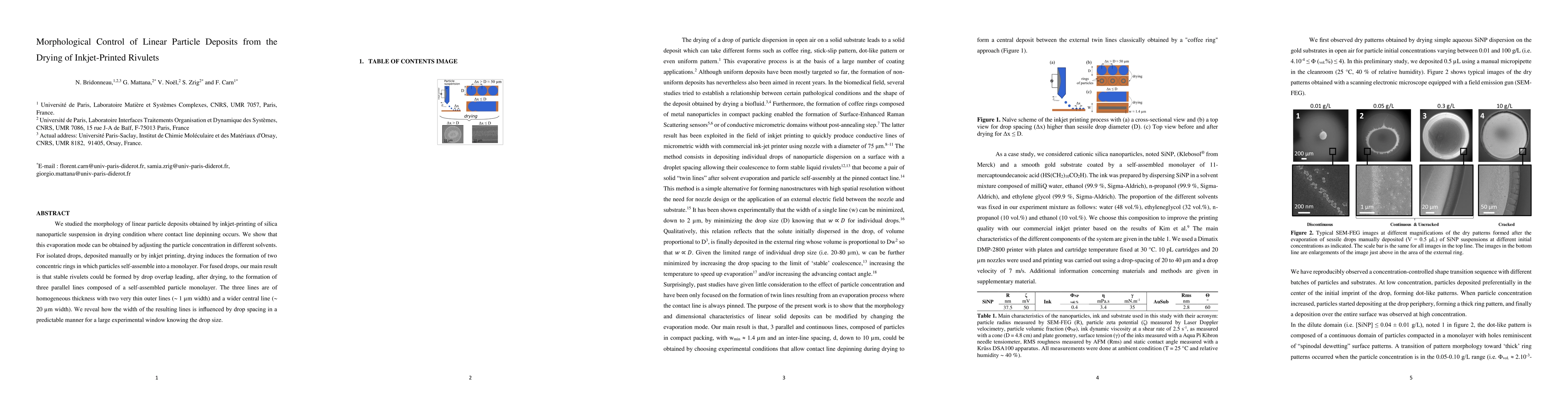 We studied the morphology of linear particle deposits obtained by inkjet-printing of silica nanoparticle suspension in drying condition where contact line depinning occurs. We show that this evaporation mode can be obtained by adjusting the particle concentration in different solvents. For isolated drops, deposited manually or by inkjet printing, drying induces the formation of two concentric rings in which particles self-assemble into a monolayer. For fused drops, our main result is that stable rivulets could be formed by drop overlap leading, after drying, to the formation of three parallel lines composed of a self-assembled particle monolayer. The three lines are of homogeneous thickness with two very thin outer lines (~ 1 $\mu$m width) and a wider central line (~ 20 $\mu$m width). We reveal how the width of the resulting lines is influenced by drop spacing in a predictable manner for a large experimental window knowing the drop size.