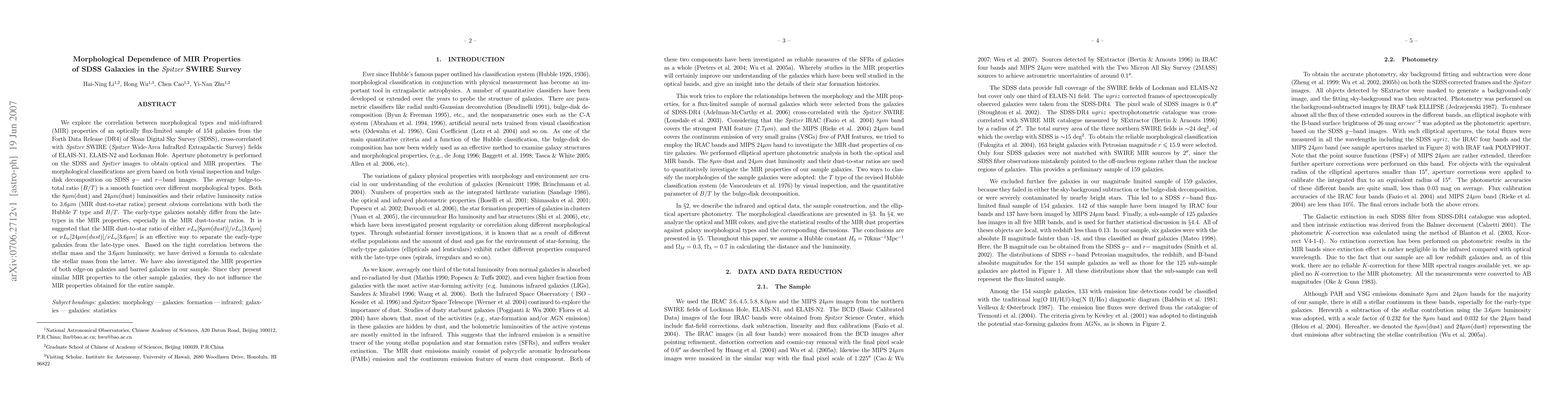 This study investigates the correlation between morphological types and mid-infrared (MIR) properties of 154 SDSS galaxies, finding that early-type galaxies differ significantly from late-types in MIR dust-to-star ratios. The research suggests using these ratios to distinguish between galaxy types and provides a formula to estimate stellar mass from MIR luminosity.