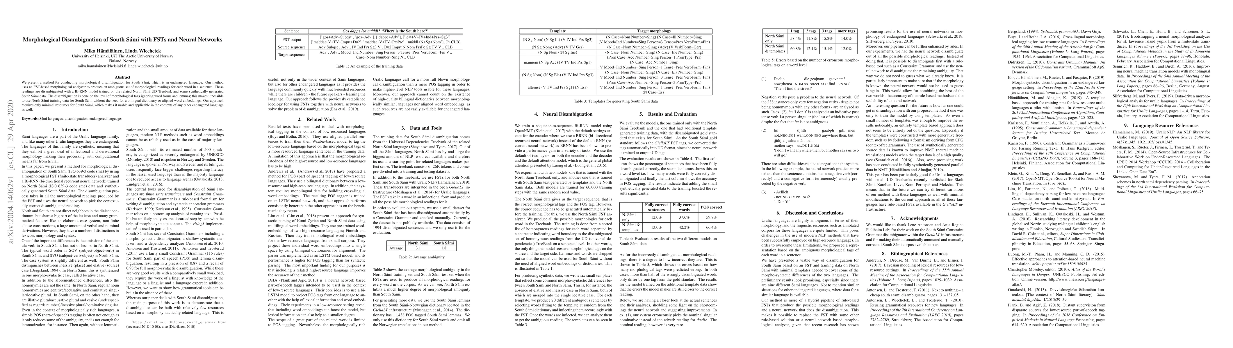We present a method for conducting morphological disambiguation for South S\'ami, which is an endangered language. Our method uses an FST-based morphological analyzer to produce an ambiguous set of morphological readings for each word in a sentence. These readings are disambiguated with a Bi-RNN model trained on the related North S\'ami UD Treebank and some synthetically generated South S\'ami data. The disambiguation is done on the level of morphological tags ignoring word forms and lemmas; this makes it possible to use North S\'ami training data for South S\'ami without the need for a bilingual dictionary or aligned word embeddings. Our approach requires only minimal resources for South S\'ami, which makes it usable and applicable in the contexts of any other endangered language as well.