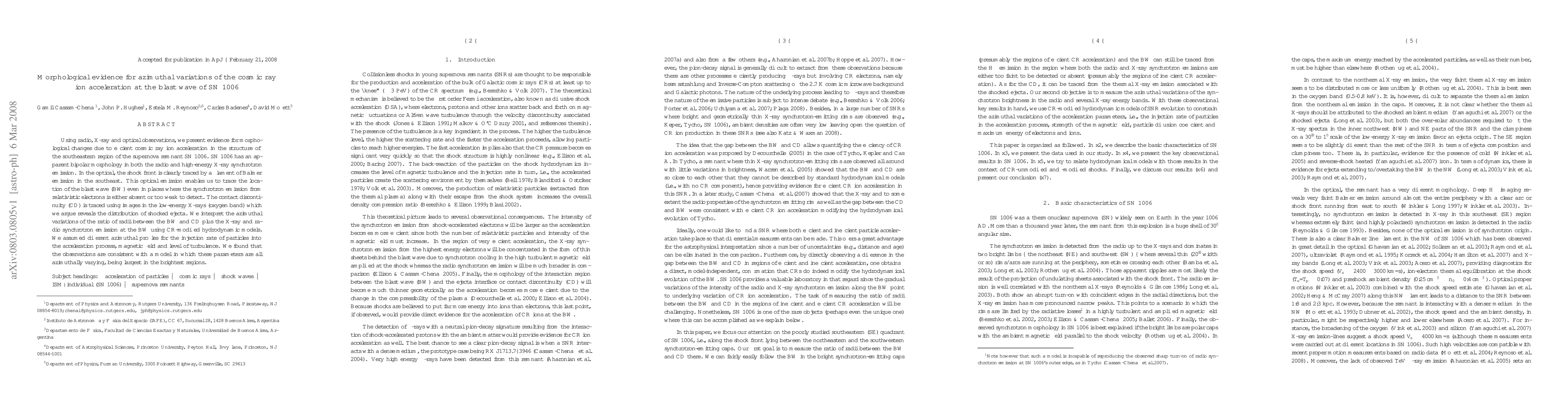The study examines SN 1006, revealing azimuthal variations in cosmic ray ion acceleration at the blast wave, using radio, X-ray, and optical observations. It finds morphological changes consistent with efficient cosmic ray acceleration, suggesting varying injection rates, magnetic fields, and turbulence levels in the brightest regions.