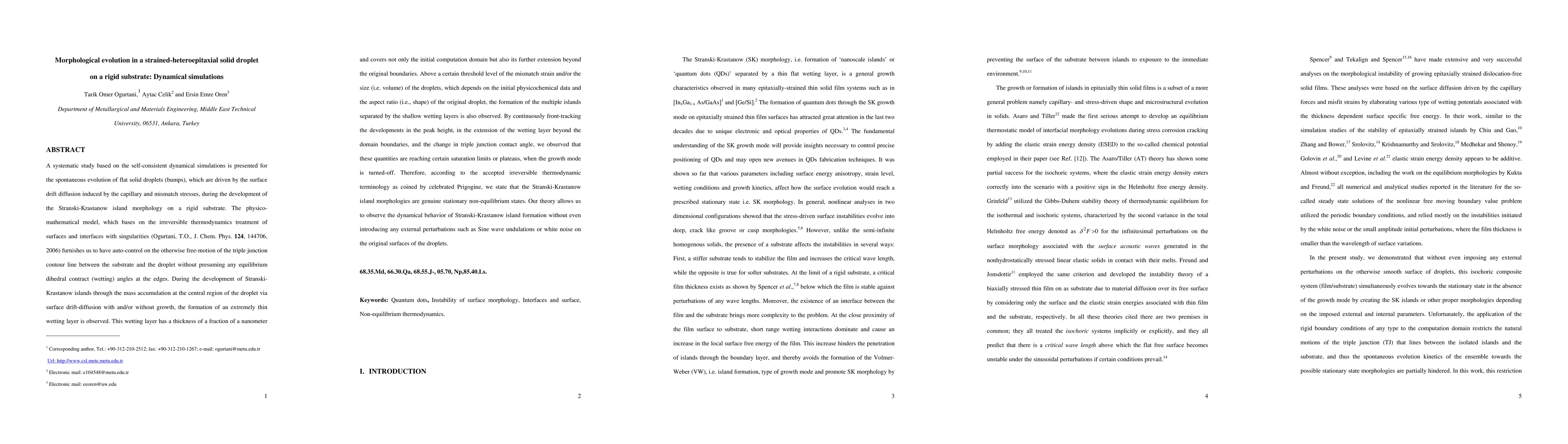 A systematic study based on the self-consistent dynamical simulations is presented for the spontaneous evolution of flat solid droplets (bumps), which are driven by the surface drift diffusion induced by the capillary and mismatch stresses, during the development of the Stranski-Krastanow island morphology on a rigid substrate. The physico-mathematical model, which bases on the irreversible thermodynamics treatment of surfaces and interfaces with singularities (Ogurtani, T.O., J. Chem. Phys. 124, 144706, 2006) furnishes us to have auto-control on the otherwise free-motion of the triple junction contour line between the substrate and the droplet without presuming any equilibrium dihedral contract (wetting) angles at the edges. During the development of Stranski-Krastanow islands through the mass accumulation at the central region of the droplet via surface drift-diffusion with and/or without growth, the formation of an extremely thin wetting layer is observed. . This wetting layer has a thickness of a fraction of a nanometer and covers not only the initial computation domain but also its further extension beyond the original boundaries. Above a certain threshold level of the mismatch strain and/or the size (i.e. volume) of the droplets, which depends on the initial physicochemical data and the aspect ratio (i.e., shape) of the original droplet, the formation of the multiple islands separated by the shallow wetting layers is also observed