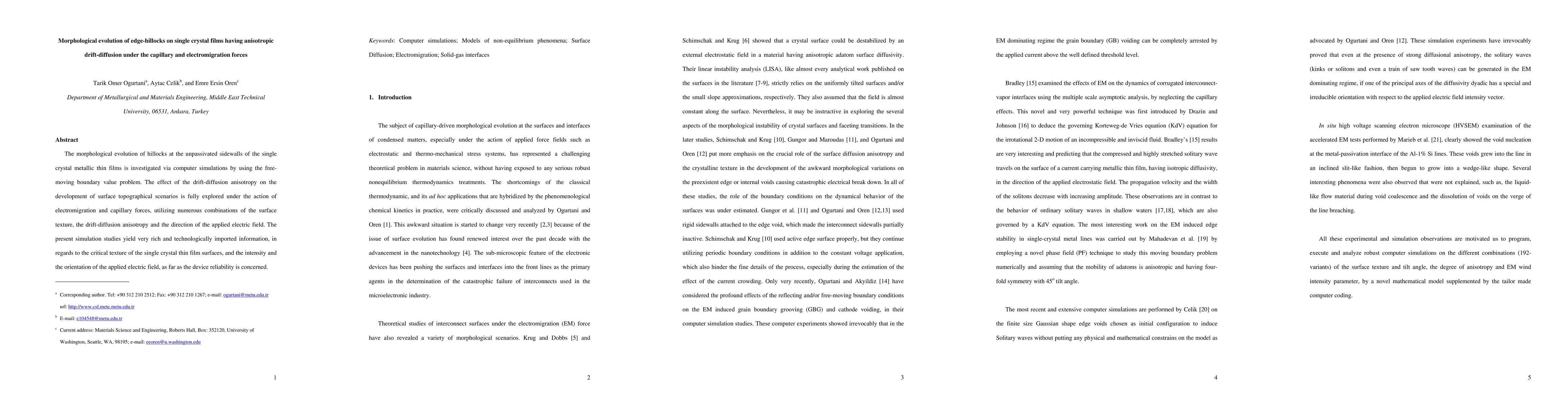 The morphological evolution of hillocks at the unpassivated sidewalls of the single crystal metallic thin films is investigated via computer simulations by using the free-moving boundary value problem. The effects of the drift-diffusion anisotropy on the development of surface topographical scenarios is fully explored under the action of electromigration and capillary forces, utilizing numerous combination of the surface texture, the drift-diffusion anisotropy and the direction of the applied electric field. The present simulation studies yield very rich and technologically imported information, in regards to the critical texture of the single crystal thin film surfaces, and the intensity and the orientation of the applied electric field, as far as the device reliability is concerned.
