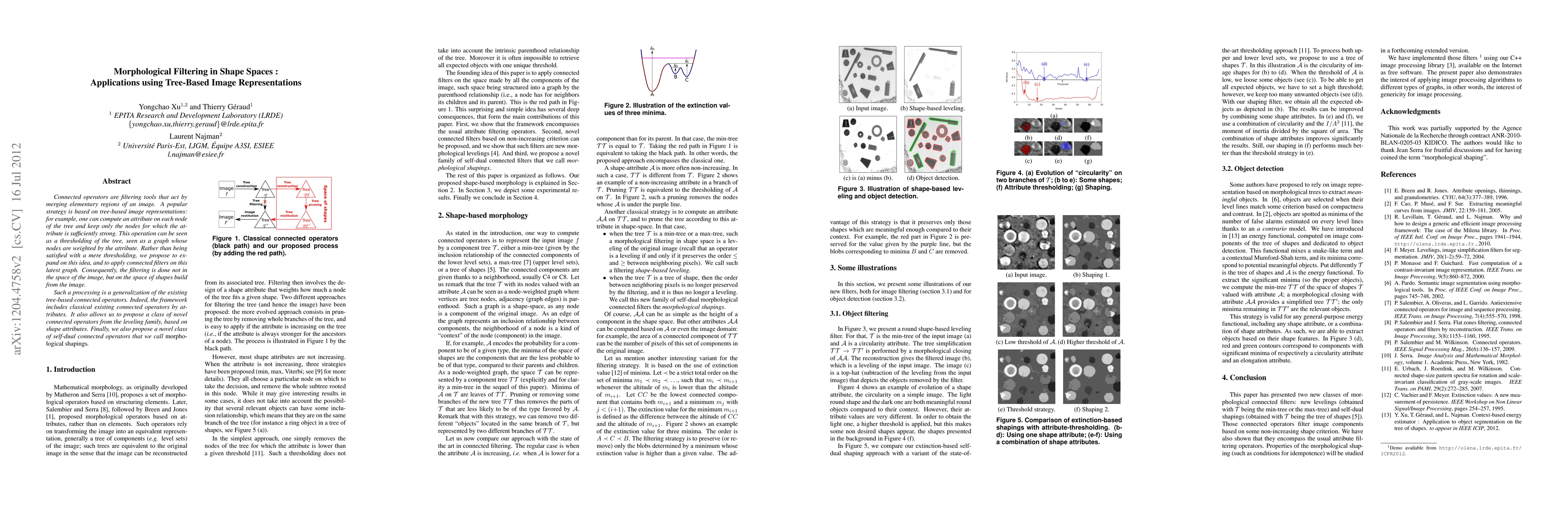 This paper proposes a novel morphological filtering approach in shape spaces using tree-based image representations, extending existing connected operators by applying filters on shape attributes derived from the image. It introduces new connected operators based on shape attributes and self-dual morphological shapings.