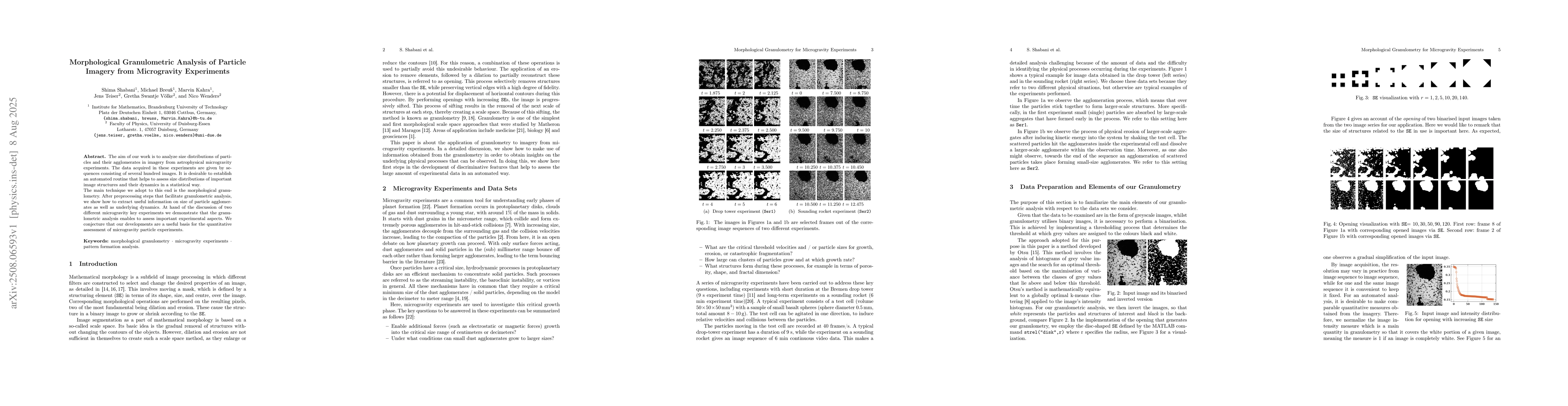 The aim of our work is to analyze size distributions of particles and their agglomerates in imagery from astrophysical microgravity experiments. The data acquired in these experiments are given by sequences consisting of several hundred images. It is desirable to establish an automated routine that helps to assess size distributions of important image structures and their dynamics in a statistical way. The main technique we adopt to this end is the morphological granulometry. After preprocessing steps that facilitate granulometric analysis, we show how to extract useful information on size of particle agglomerates as well as underlying dynamics. At hand of the discussion of two different microgravity key experiments we demonstrate that the granulometric analysis enables to assess important experimental aspects. We conjecture that our developments are a useful basis for the quantitative assessment of microgravity particle experiments.