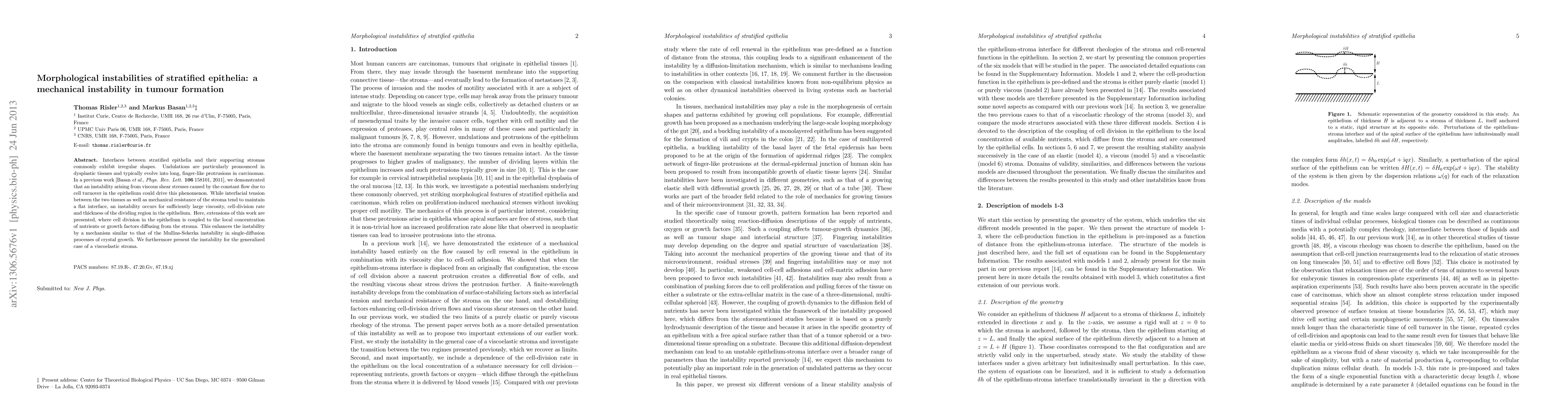 Interfaces between stratified epithelia and their supporting stromas commonly exhibit irregular shapes. Undulations are particularly pronounced in dysplastic tissues and typically evolve into long, finger-like protrusions in carcinomas. In a previous work (Basan et al., Phys. Rev. Lett. 106, 158101 (2011)), we demonstrated that an instability arising from viscous shear stresses caused by the constant flow due to cell turnover in the epithelium could drive this phenomenon. While interfacial tension between the two tissues as well as mechanical resistance of the stroma tend to maintain a flat interface, an instability occurs for sufficiently large viscosity, cell-division rate and thickness of the dividing region in the epithelium. Here, extensions of this work are presented, where cell division in the epithelium is coupled to the local concentration of nutrients or growth factors diffusing from the stroma. This enhances the instability by a mechanism similar to that of the Mullins-Sekerka instability in single-diffusion processes of crystal growth. We furthermore present the instability for the generalized case of a viscoelastic stroma.
