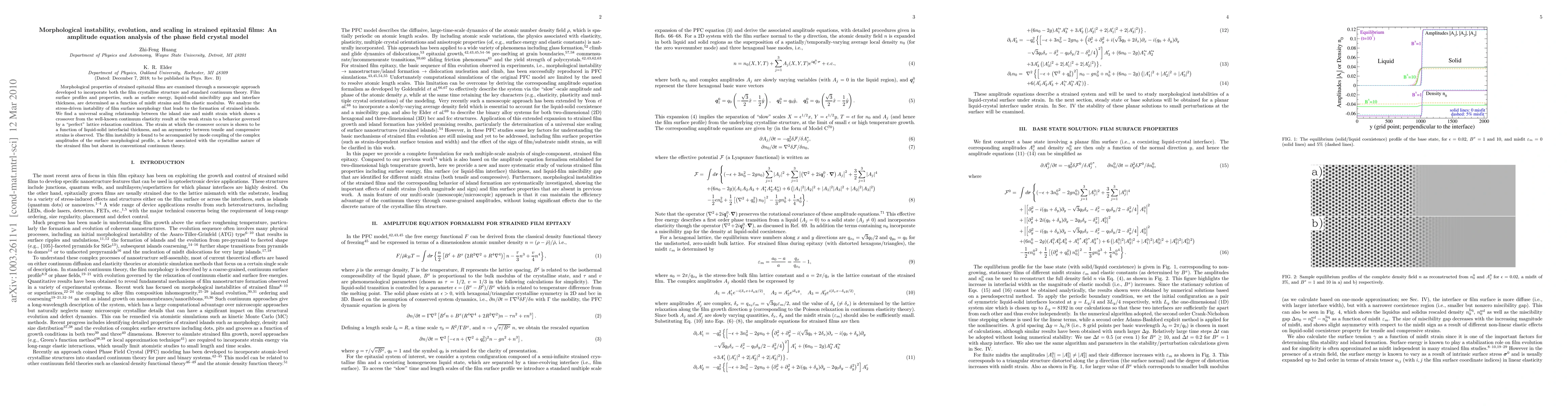 This paper uses a mesoscopic phase field crystal model to investigate the morphological instability and evolution in strained epitaxial films, revealing a universal scaling relationship between island size and misfit strain, and identifying a crossover behavior influenced by the liquid-solid interfacial thickness and strain asymmetry.