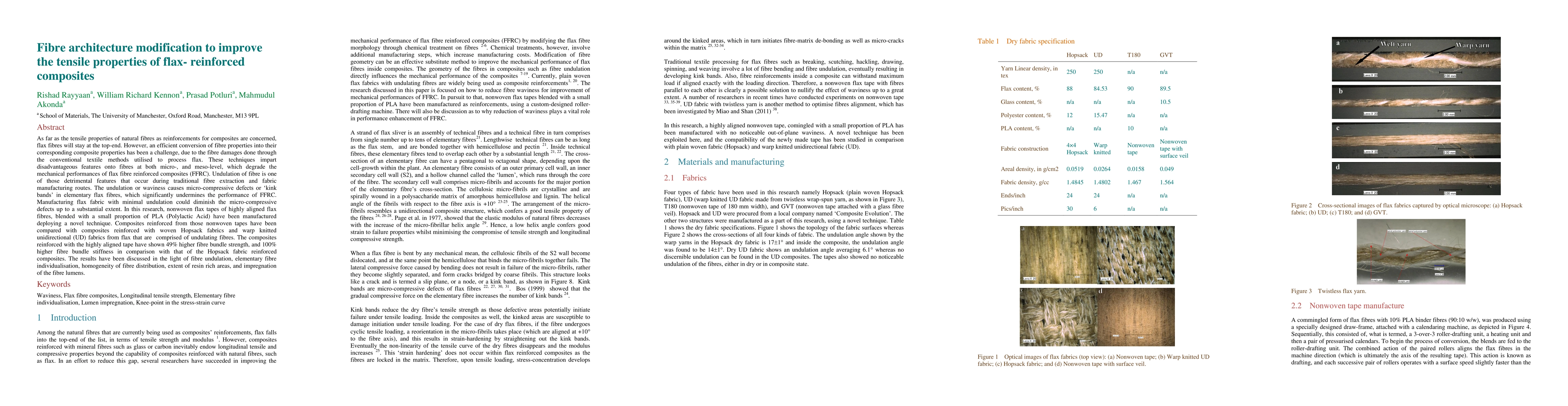 This research investigates the morphological modification of flax fibre bundles to enhance the tensile properties of flax fibre reinforced epoxy composites. Nonwoven flax tapes with highly aligned fibres, compared to woven and knitted flax fabrics, showed significantly improved fibre bundle strength and stiffness, highlighting the detrimental effects of fibre undulation on composite performance.