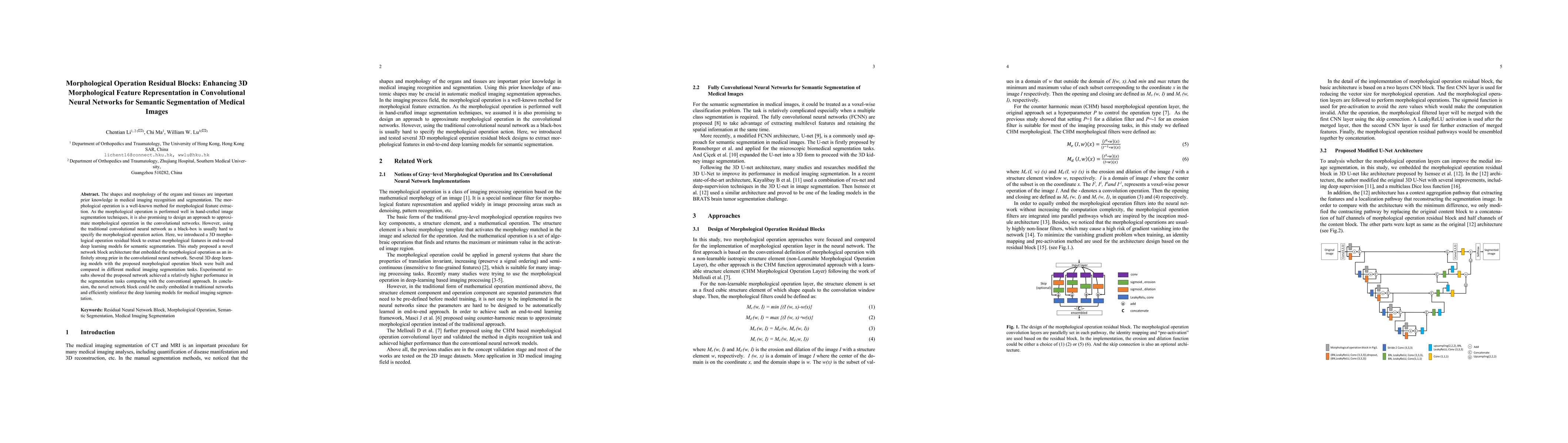 The shapes and morphology of the organs and tissues are important prior knowledge in medical imaging recognition and segmentation. The morphological operation is a well-known method for morphological feature extraction. As the morphological operation is performed well in hand-crafted image segmentation techniques, it is also promising to design an approach to approximate morphological operation in the convolutional networks. However, using the traditional convolutional neural network as a black-box is usually hard to specify the morphological operation action. Here, we introduced a 3D morphological operation residual block to extract morphological features in end-to-end deep learning models for semantic segmentation. This study proposed a novel network block architecture that embedded the morphological operation as an infinitely strong prior in the convolutional neural network. Several 3D deep learning models with the proposed morphological operation block were built and compared in different medical imaging segmentation tasks. Experimental results showed the proposed network achieved a relatively higher performance in the segmentation tasks comparing with the conventional approach. In conclusion, the novel network block could be easily embedded in traditional networks and efficiently reinforce the deep learning models for medical imaging segmentation.