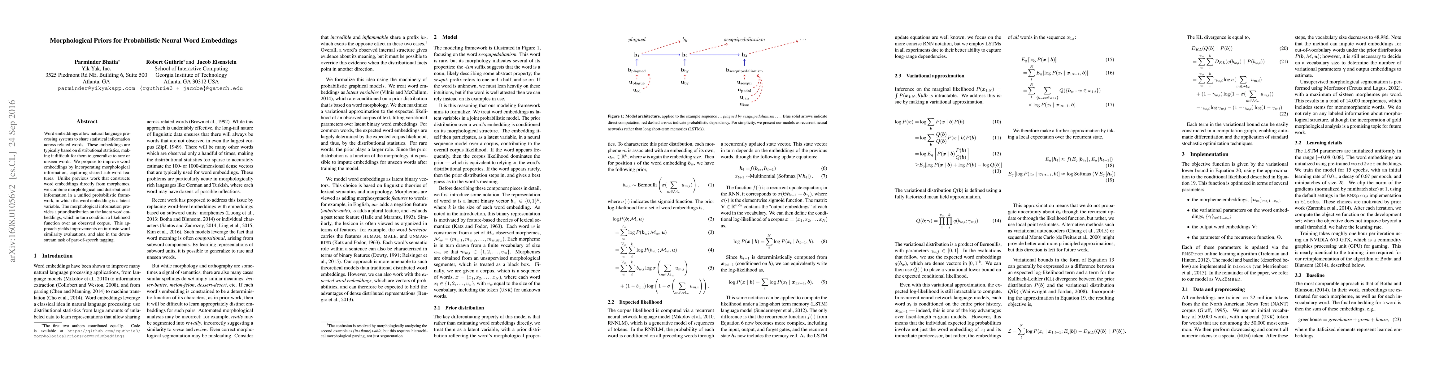This paper proposes a method to enhance word embeddings by integrating morphological information, which captures shared sub-word features, within a probabilistic framework. The morphological priors improve generalization to rare or unseen words, leading to better performance in word similarity tasks and part-of-speech tagging.