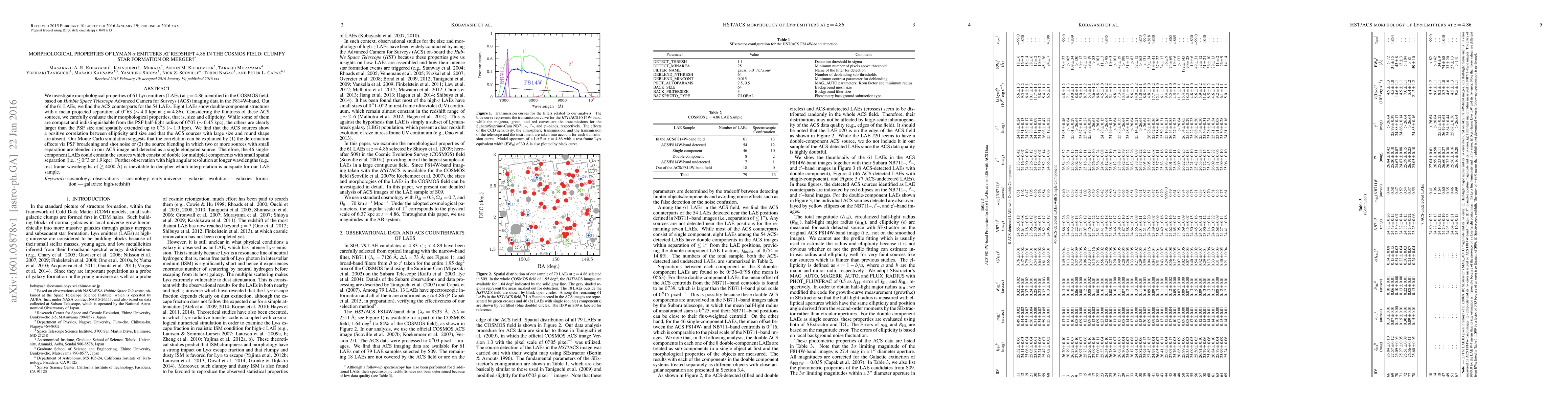 The research examines 61 Lyman-alpha emitters (LAEs) at redshift 4.86 in the COSMOS field, finding 8 with double-component structures and a positive correlation between ellipticity and size in the remaining single-component LAEs. The study suggests these features could be due to PSF broadening or source blending, indicating potential mergers or clumpy star formation. High angular resolution observations at longer wavelengths are recommended to confirm.