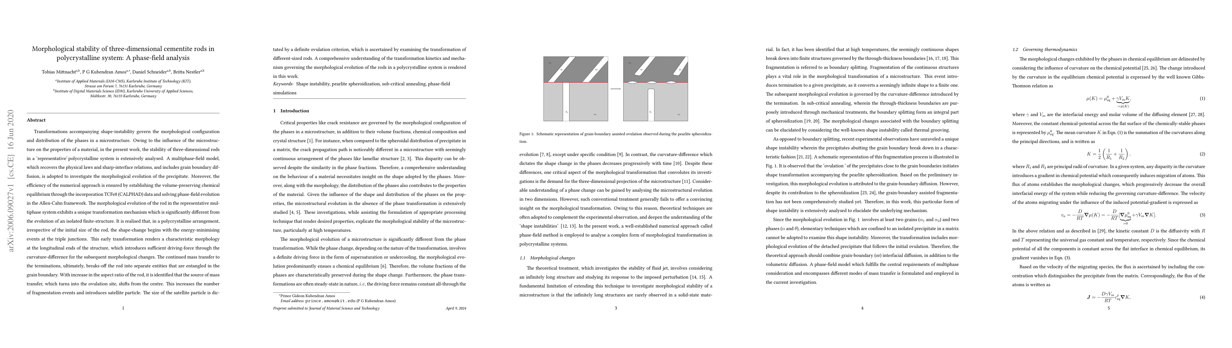 Transformations accompanying shape-instability govern the morphological configuration and distribution of the phases in a microstructure. Owing to the influence of the microstructure on the properties of a material, the stability of three-dimensional rods in a representative polycrystalline system is extensively analysed. A multiphase-field model, which recovers the physical laws and sharp-interface relations, and includes grain boundary diffusion, is adopted to investigate the morphological evolution of the precipitate. Moreover, the efficiency of the numerical approach is ensured by establishing the volume-preserving chemical equilibrium through the incorporation TCFe8 (CALPHAD) data and solving phase-field evolution in the Allen-Cahn framework. The morphological evolution of the rod in the multiphase system exhibits a unique transformation mechanism which is significantly different from the evolution of an isolated finite-structure. It is realised that, in a polycrystalline arrangement, irrespective of the initial rod-size , the shape-change begins with the energy-minimising events at the triple junctions. This early transformation renders a characteristic morphology at the longitudinal ends of the structure, which introduces sufficient driving-force through the curvature-difference for the subsequent morphological changes. The continued mass transfer to the terminations, ultimately, breaks-off the rod into separate entities that are entangled in the grain boundary. With increasing aspect ratio of the rod, it is identified that the source of mass transfer, which turns into the ovulation site, shifts from the centre. This increases the number of fragmentation events and introduces satellite particle. A comprehensive understanding of the transformation kinetics and mechanism governing the morphological evolution of the rods in a polycrystalline system is rendered in this work.