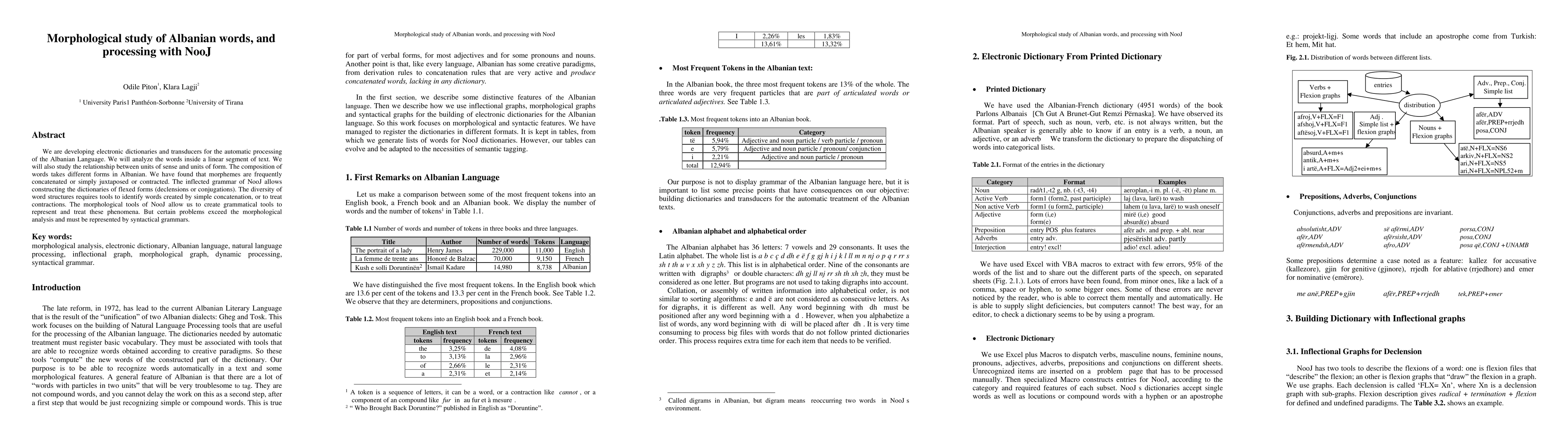 We are developing electronic dictionaries and transducers for the automatic processing of the Albanian Language. We will analyze the words inside a linear segment of text. We will also study the relationship between units of sense and units of form. The composition of words takes different forms in Albanian. We have found that morphemes are frequently concatenated or simply juxtaposed or contracted. The inflected grammar of NooJ allows constructing the dictionaries of flexed forms (declensions or conjugations). The diversity of word structures requires tools to identify words created by simple concatenation, or to treat contractions. The morphological tools of NooJ allow us to create grammatical tools to represent and treat these phenomena. But certain problems exceed the morphological analysis and must be represented by syntactical grammars.