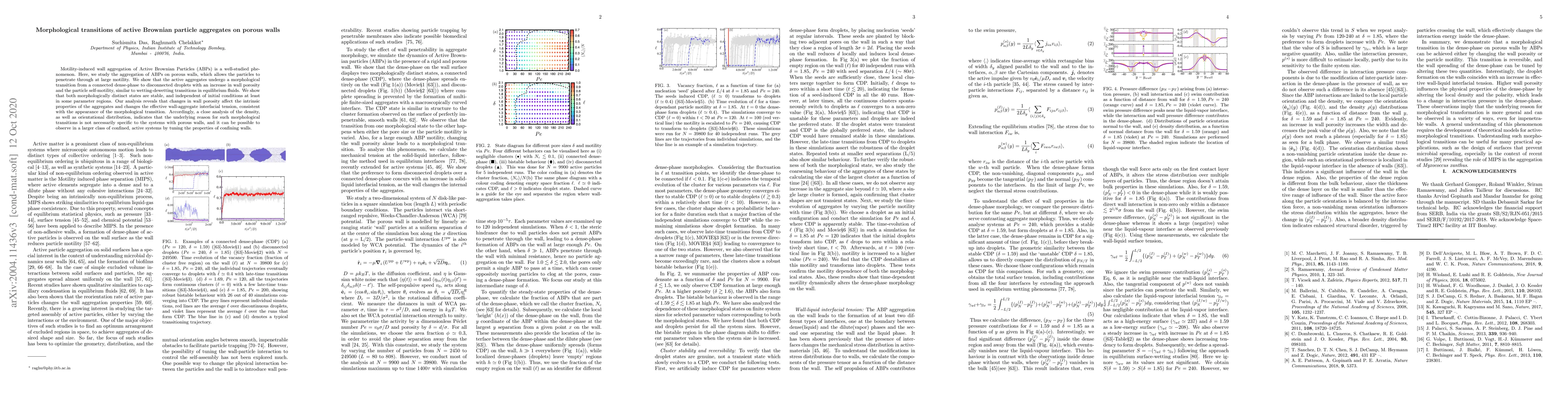 This paper investigates the morphological transitions of active Brownian particles aggregating on porous walls, revealing a shift from dense connected phases to disconnected droplets with increased porosity and self-motility. The study finds that both aggregate states are stable and that changes in wall porosity alter the effective interfacial tension, suggesting similar transitions could occur in a broader range of confined active systems.