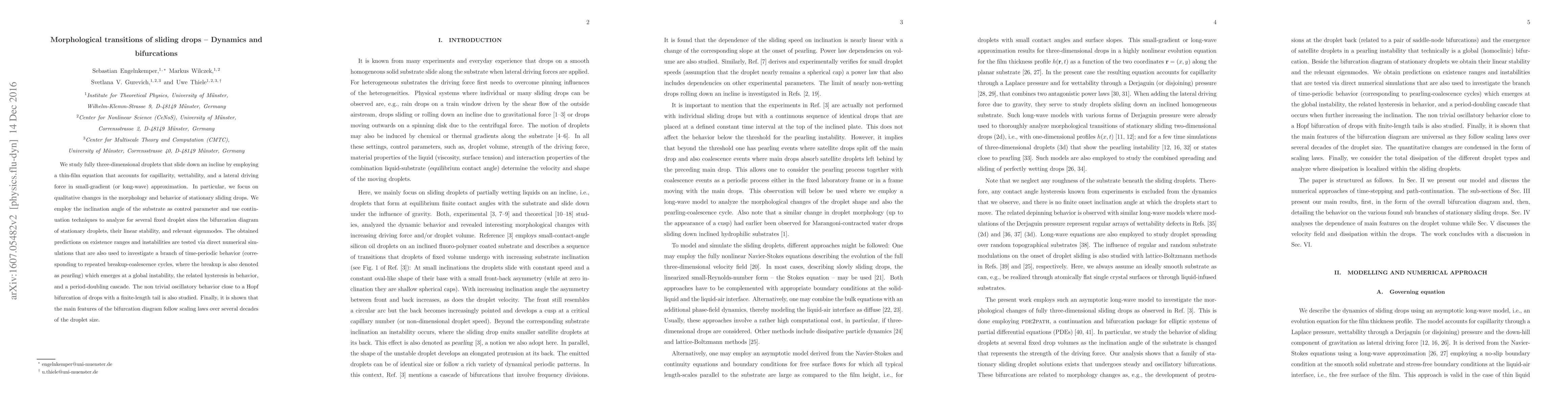 Researchers studied how sliding drops change shape as they slide down an incline, finding bifurcations in their behavior that lead to new patterns of movement, including periodic cycles and oscillations.
