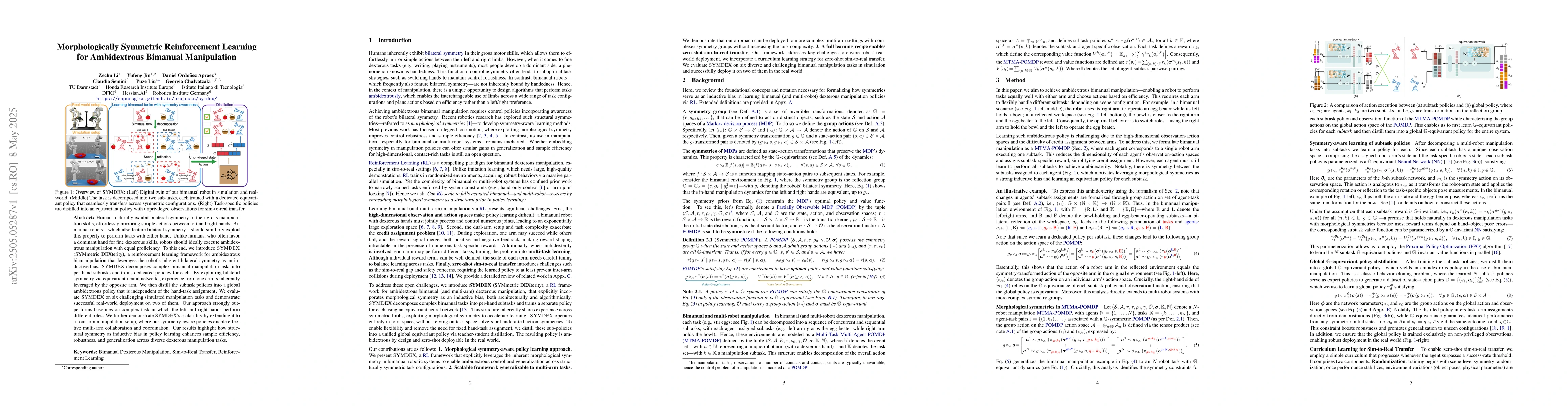 The paper introduces SYMDEX, a reinforcement learning framework for ambidextrous bimanual manipulation that leverages bilateral symmetry as an inductive bias. It decomposes complex tasks into per-hand subtasks, trains dedicated policies for each, and distills them into a global ambidextrous policy independent of hand-task assignment.