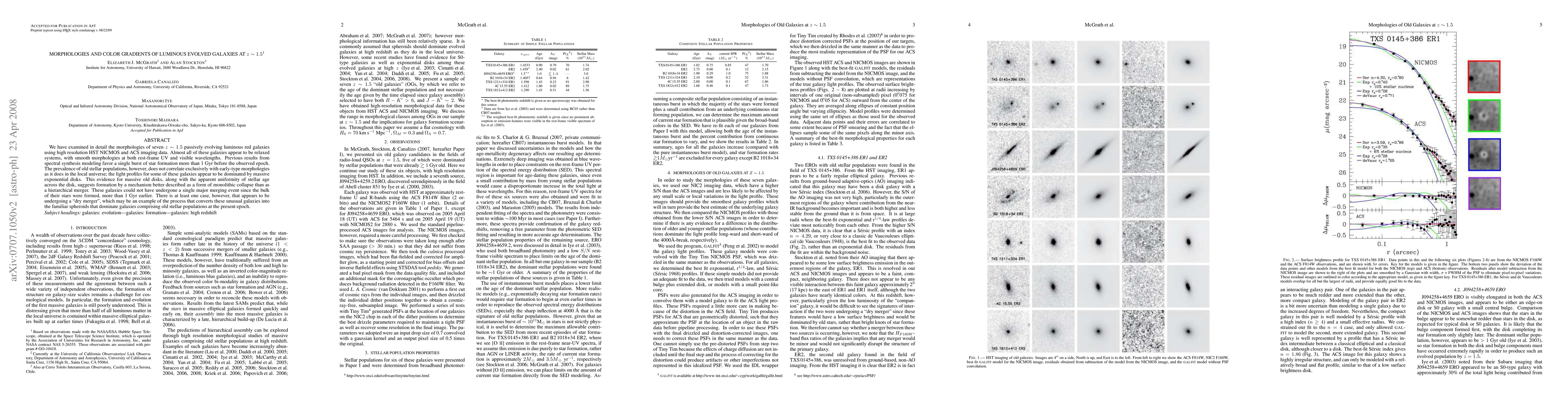 This paper examines the morphologies and color gradients of seven luminous red galaxies at z~1.5, revealing that most have smooth, relaxed structures with old stellar populations, suggesting a monolithic collapse formation rather than hierarchical mergers. One galaxy shows signs of a "dry merger," hinting at a potential transition process into the typical spheroids seen today.