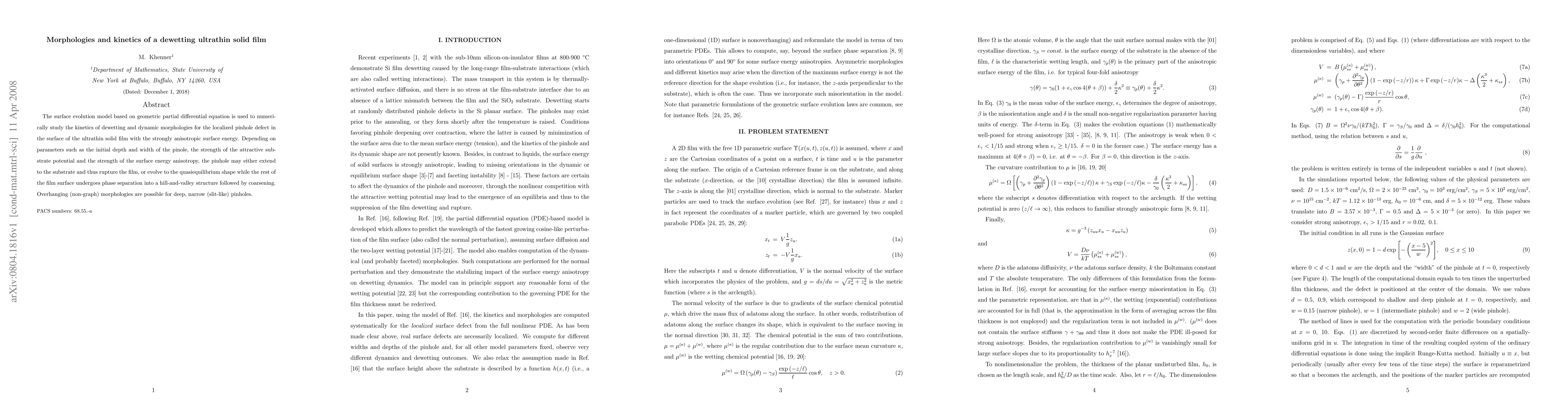 This paper numerically studies the kinetics and morphologies of dewetting in ultrathin solid films with localized pinhole defects, revealing that the film's evolution depends on factors like pinhole size and surface energy anisotropy, potentially leading to film rupture or quasiequilibrium shapes with hill-and-valley structures. Overhanging morphologies can occur in deep, narrow pinholes.