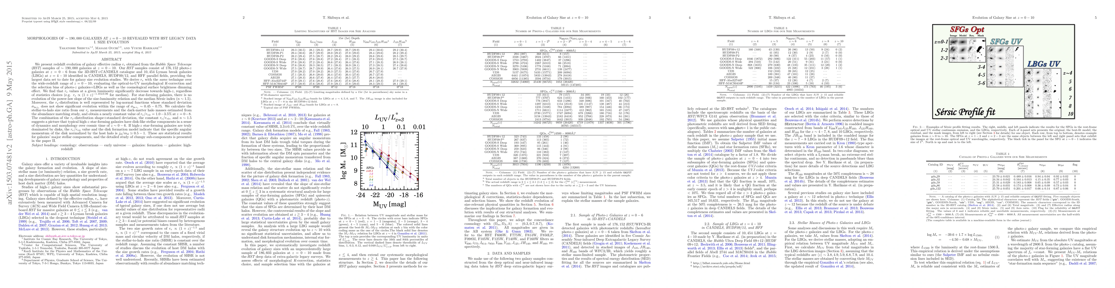 This paper investigates the redshift evolution of galaxy effective radius (r_e) using ~190,000 galaxies from HST data, finding that r_e decreases significantly towards high-z. Star-forming galaxies show no evolution in the size-luminosity relation and a median Sersic index of ~1.5, indicating disk-like stellar components over cosmic time.