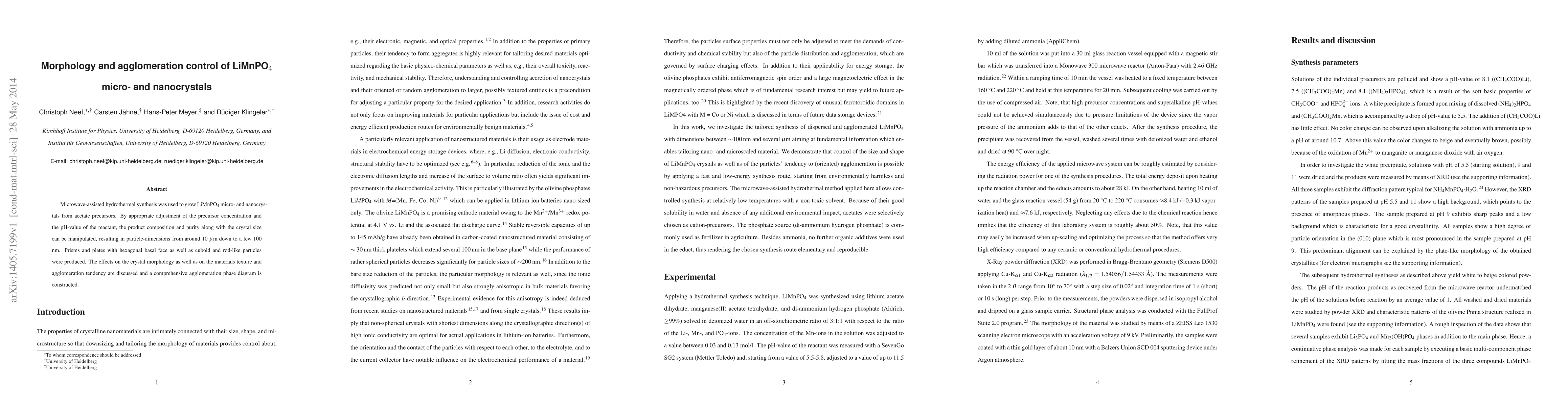 Microwave-assisted hydrothermal synthesis was used to grow LiMnPO$_4$ micro- and nanocrystals from acetate precursors. By appropriate adjustment of the precursor concentration and the pH-value of the reactant, the product composition and purity along with the crystal size can be manipulated, resulting in particle-dimensions from around 10 mm down to a few 100 nm. Prisms and plates with hexagonal basal face as well as cuboid and rod-like particles were produced. The effects on the crystal morphology as well as on the materials texture and agglomeration tendency are discussed and a comprehensive agglomeration phase diagram is constructed.
