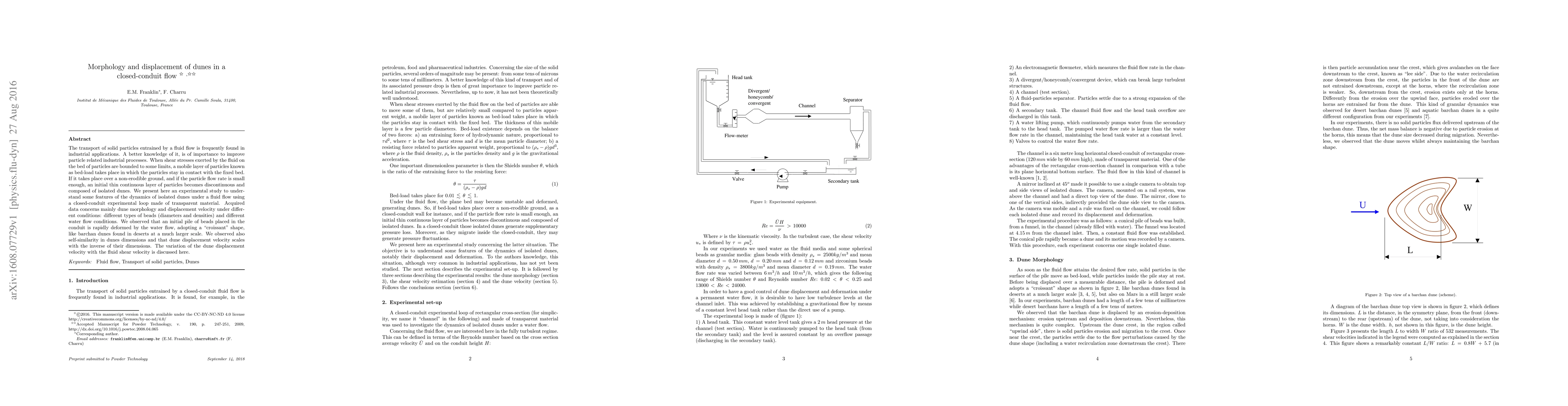 The transport of solid particles entrained by a fluid flow is frequently found in industrial applications. A better knowledge of it, is of importance to improve particle related industrial processes. When shear stresses exerted by the fluid on the bed of particles are bounded to some limits, a mobile layer of particles known as bed-load takes place in which the particles stay in contact with the fixed bed. If it takes place over a non-erodible ground, and if the particle flow rate is small enough, an initial thin continuous layer of particles becomes discontinuous and composed of isolated dunes. We present here an experimental study to understand some features of the dynamics of isolated dunes under a fluid flow using a closed-conduit experimental loop made of transparent material. Acquired data concerns mainly dune morphology and displacement velocity under different conditions: different types of beads (diameters and densities) and different water flow conditions. We observed that an initial pile of beads placed in the conduit is rapidly deformed by the water flow, adopting a "croissant" shape, like barchan dunes found in deserts at a much larger scale. We observed also self-similarity in dunes dimensions and that dune displacement velocity scales with the inverse of their dimensions. The variation of the dune displacement velocity with the fluid shear velocity is discussed here.