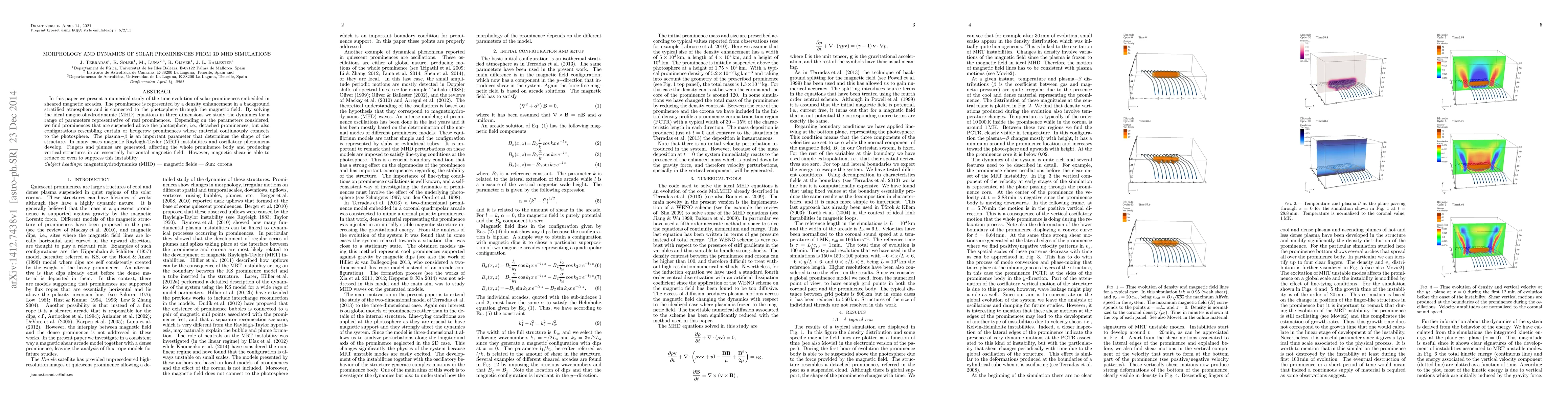 This paper uses 3D MHD simulations to study the morphology and dynamics of solar prominences in sheared magnetic arcades, finding that plasma $\beta$ influences their shape and that magnetic shear can mitigate instabilities like MRT, leading to various prominence configurations.
