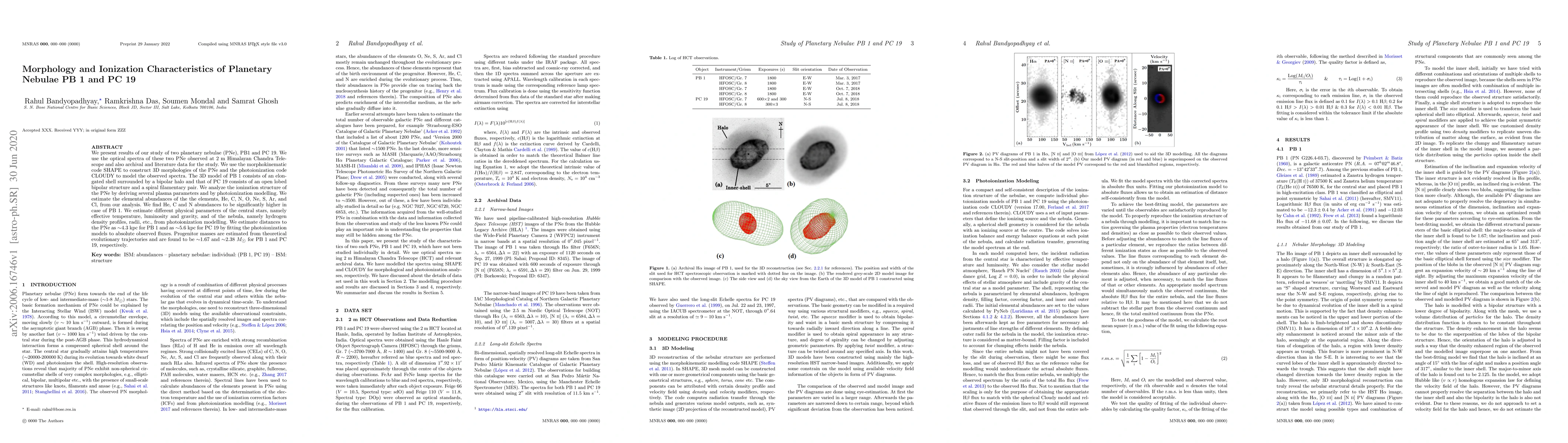 We present results of our study of two planetary nebulae (PNe), PB1 and PC 19. We use the optical spectra of these two PNe observed at 2 m Himalayan Chandra Telescope and also archival and literature data for the study. We use the morphokinematic code SHAPE to construct 3D morphologies of the PNe and the photoionization code CLOUDY to model the observed spectra. The 3D model of PB 1 consists of an elongated shell surrounded by a bipolar halo and that of PC 19 consists of an open lobed bipolar structure and a spiral filamentary pair. We analyze the ionization structure of the PNe by deriving several plasma parameters and by photoionization modelling. We estimate the elemental abundances of the the elements, He, C, N, O, Ne, S, Ar, and Cl, from our analysis. We find He, C and N abundances to be significantly higher in case of PB 1. We estimate different physical parameters of the central stars, namely effective temperature, luminosity and gravity, and of the nebula, namely hydrogen density profiles, radii, etc., from photoionization modelling. We estimate distances to the PNe as $\sim$4.3 kpc for PB 1 and as $\sim$5.6 kpc for PC 19 by fitting the photoionization models to absolute observed fluxes. Progenitor masses are estimated from theoretical evolutionary trajectories and are found to be $\sim$1.67 and $\sim$2.38 $M_{\odot}$ for PB 1 and PC 19, respectively.