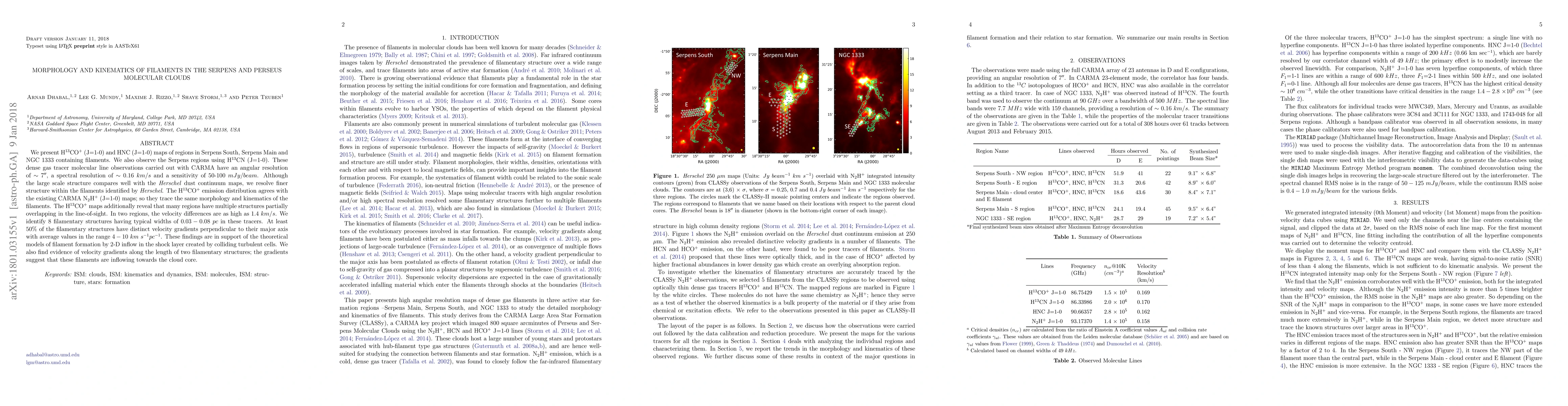 We present H13CO+ (J=1-0) and HNC (J=1-0) maps of regions in Serpens South, Serpens Main and NGC 1333 containing filaments. We also observe the Serpens regions using H13CN (J=1-0). These dense gas tracer molecular line observations carried out with CARMA have an angular resolution of ~7", a spectral resolution of ~0.16 km/s and a sensitivity of 50-100 mJy/beam. Although the large scale structure compares well with the Herschel dust continuum maps, we resolve finer structure within the filaments identified by Herschel. The H13CO+ emission distribution agrees with the existing CARMA N2H+ (J=1-0) maps; so they trace the same morphology and kinematics of the filaments. The H13CO+ maps additionally reveal that many regions have multiple structures partially overlapping in the line-of-sight. In two regions, the velocity differences are as high as 1.4 m/s. We identify 8 filamentary structures having typical widths of 0.03-0.08 pc in these tracers. At least 50% of the filamentary structures have distinct velocity gradients perpendicular to their major axis with average values in the range 4-10 km/s/pc. These findings are in support of the theoretical models of filament formation by 2-D inflow in the shock layer created by colliding turbulent cells. We also find evidence of velocity gradients along the length of two filamentary structures; the gradients suggest that these filaments are inflowing towards the cloud core.