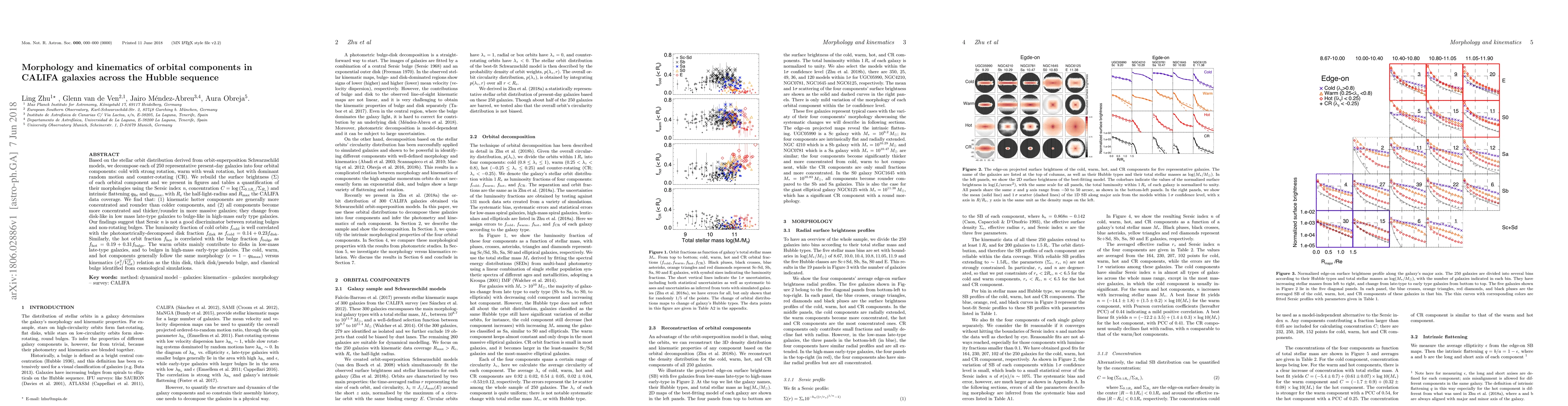 Based on the stellar orbit distribution derived from orbit-superposition Schwarzschild models, we decompose each of 250 representative present-day galaxies into four orbital components: cold with strong rotation, warm with weak rotation, hot with dominant random motion and counter-rotating (CR). We rebuild the surface brightness ($\Sigma$) of each orbital component and we present in figures and tables a quantification of their morphologies using the Sersic index \textit{n}, concentration $C = \log{(\Sigma_{0.1R_e}/\Sigma_{R_e})}$ and intrinsic flattening $q_{\mathrm{Re}}$ and $q_{\mathrm{Rmax}}$, with $R_e$ the half-light-radius and $R_{\mathrm{max}}$ the CALIFA data coverage. We find that: (1) kinematic hotter components are generally more concentrated and rounder than colder components, and (2) all components become more concentrated and thicker/rounder in more massive galaxies; they change from disk-like in low mass late-type galaxies to bulge-like in high-mass early type galaxies. Our findings suggest that Sersic \textit{n} is not a good discriminator between rotating bulges and non-rotating bulges. The luminosity fraction of cold orbits $f_{\rm cold}$ is well correlated with the photometrically-decomposed disk fraction $f_{\rm disk}$ as $f_{\mathrm{cold}} = 0.14 + 0.23f_{\mathrm{\mathrm{disk}}}$. Similarly, the hot orbit fraction $f_{\rm hot}$ is correlated with the bulge fraction $f_{\rm bulge}$ as $f_{\mathrm{hot}} = 0.19 + 0.31f_{\mathrm{\mathrm{bulge}}}$. The warm orbits mainly contribute to disks in low-mass late-type galaxies, and to bulges in high-mass early-type galaxies. The cold, warm, and hot components generally follow the same morphology ($\epsilon = 1-q_{\rm Rmax}$) versus kinematics ($\sigma_z^2/\overline{V_{\mathrm{tot}}^2}$) relation as the thin disk, thick disk/pseudo bulge, and classical bulge identified from cosmological simulations.