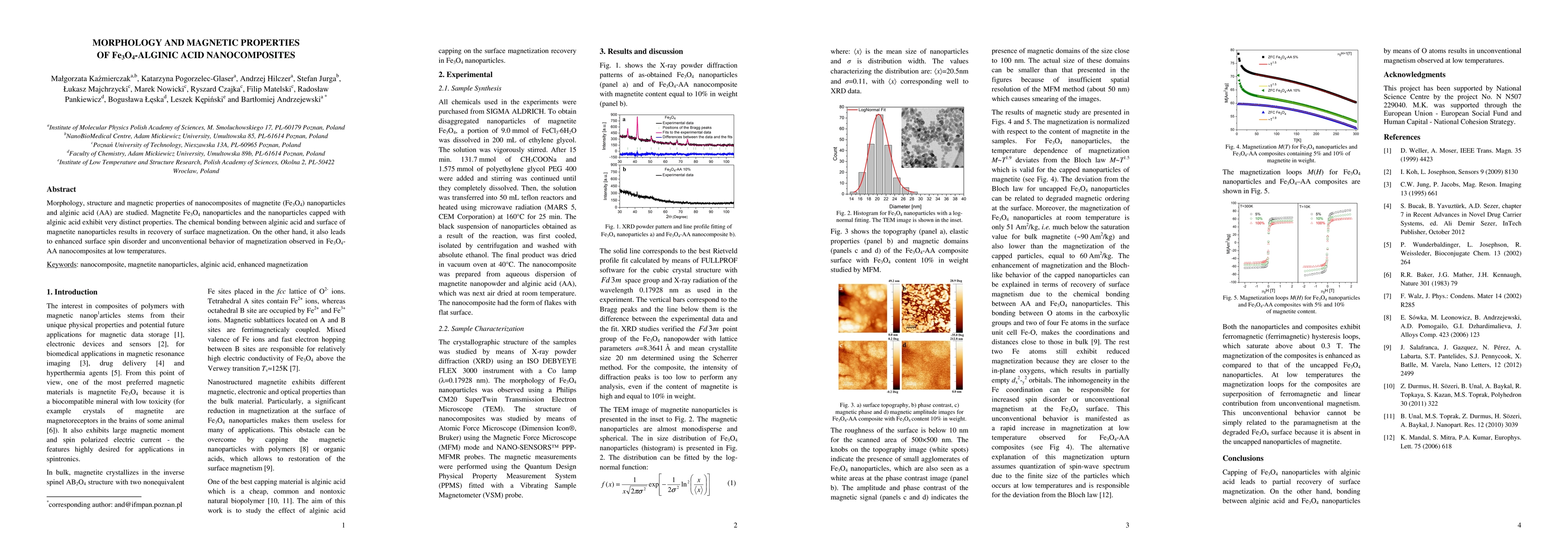 This study investigates the morphology, structure, and magnetic properties of Fe3O4-alginic acid nanocomposites, revealing that the chemical bonding between alginic acid and magnetite nanoparticles restores surface magnetization but also induces enhanced surface spin disorder and unusual magnetization behavior at low temperatures.