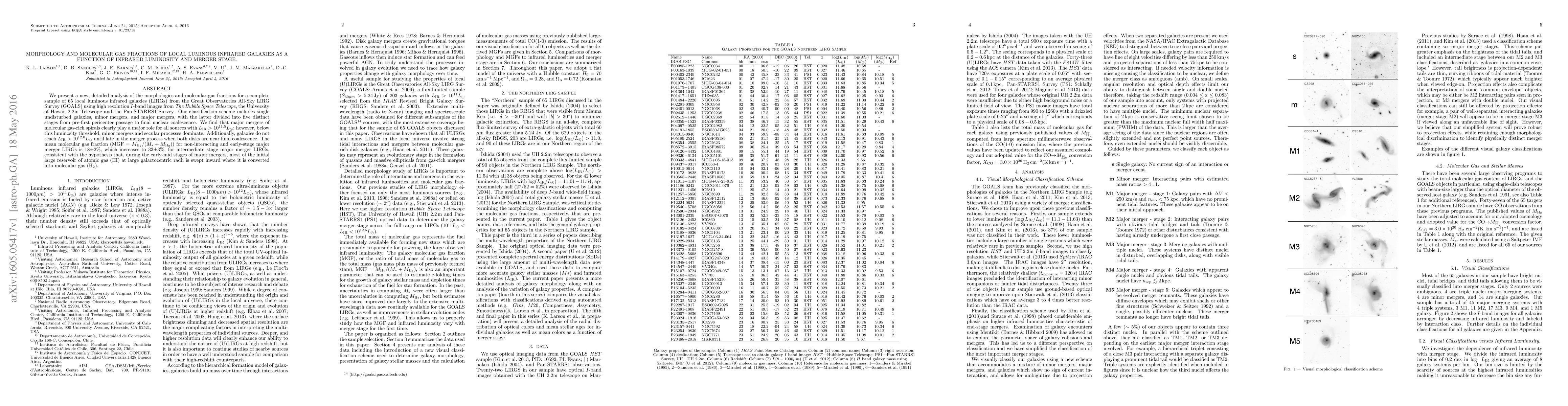 We present a new, detailed analysis of the morphologies and molecular gas fractions for a complete sample of 65 local luminous infrared galaxies (LIRGs) from the Great Observatories All-Sky LIRG Survey (GOALS) using high resolution $I$-band images from The Hubble Space Telescope, the University of Hawaii 2.2m Telescope and the Pan-STARRS1 Survey. Our classification scheme includes single undisturbed galaxies, minor mergers, and major mergers, with the latter divided into five distinct stages from pre-first pericenter passage to final nuclear coalescence. We find that major mergers of molecular gas-rich spirals clearly play a major role for all sources with $L_{\rm IR} > 10^{11.5} L_\odot $; however, below this luminosity threshold, minor mergers and secular processes dominate. Additionally, galaxies do not reach $L_{\rm IR} > 10^{12.0} L_\odot $ until late in the merger process when both disks are near final coalescence. The mean molecular gas fraction (MGF $= M_{\rm H_2} / (M_* + M_{\rm H_2})$) for non-interacting and early-stage major merger LIRGs is 18$\pm 2$%, which increases to 33$\pm 3$%, for intermediate stage major merger LIRGs, consistent with the hypothesis that, during the early-mid stages of major mergers, most of the initial large reservoir of atomic gas (HI) at large galactocentric radii is swept inward where it is converted into molecular gas (H$_2$).