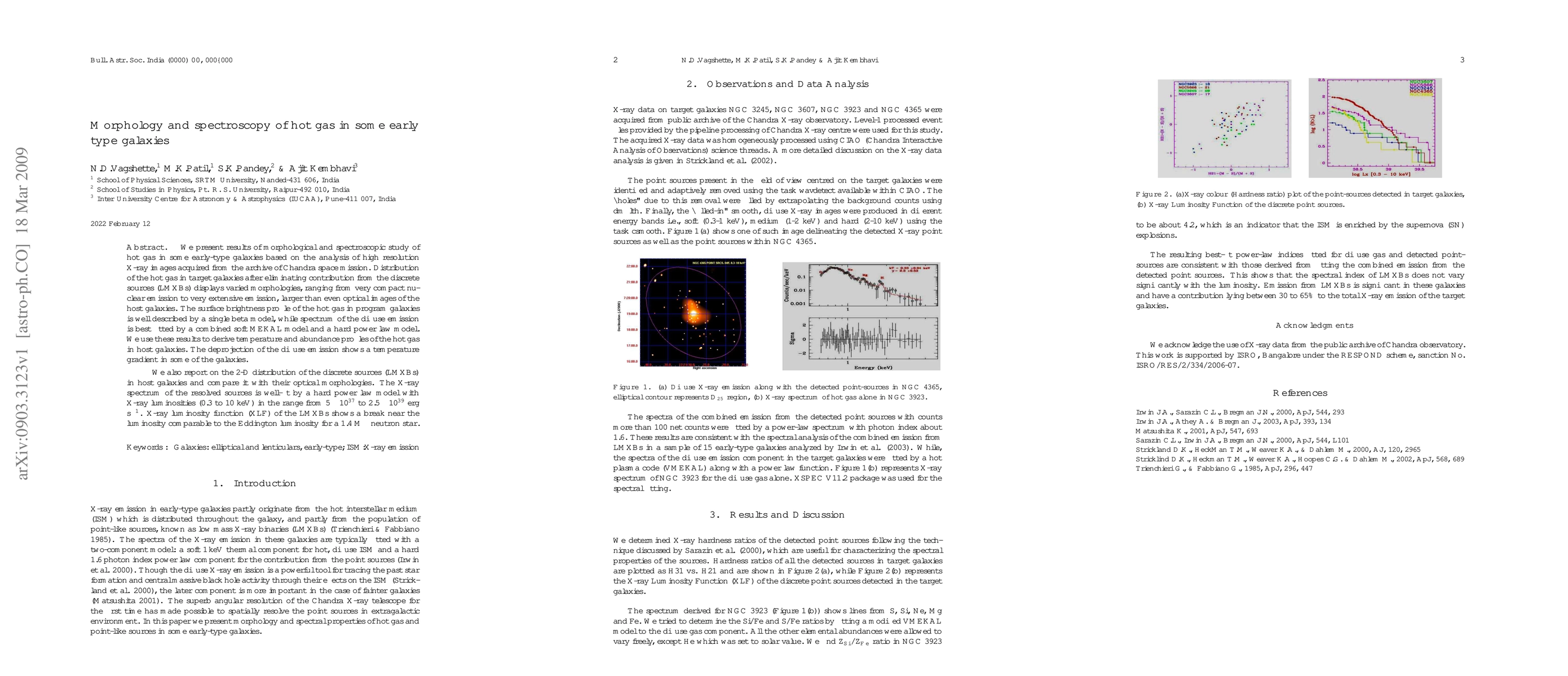 We present results of morphological and spectroscopic study of hot gas in some early-type galaxies based on the analysis of high resolution X-ray images acquired from the archive of Chandra space mission. Distribution of the hot gas in target galaxies after eliminating contribution from the discrete sources (LMXBs) displays varied morphologies, ranging from very compact nuclear emission to very extensive emission, larger than even optical images of the host galaxies. The surface brightness profile of the hot gas in program galaxies is well described by a single beta model, while spectrum of the diffuse emission is best fitted by a combined soft MEKAL model and a hard power law model. We use these results to derive temperature and abundance profiles of the hot gas in host galaxies. The deprojection of the diffuse emission shows a temperature gradient in some of the galaxies. We also report on the 2-D distribution of the discrete sources (LMXBs) in host galaxies and compare it with their optical morphologies. The X-ray spectrum of the resolved sources is well-fit by a hard power law model with X-ray luminosities (0.3 to 10 keV) in the range from 5$\times$ 10$^{37}$ to 2.5$\times$ 10$^{39}$ erg s$^{-1}$. X-ray luminosity function (XLF) of the LMXBs shows a break near the luminosity comparable to the Eddington luminosity for a 1.4 M$_\odot$ neutron star.