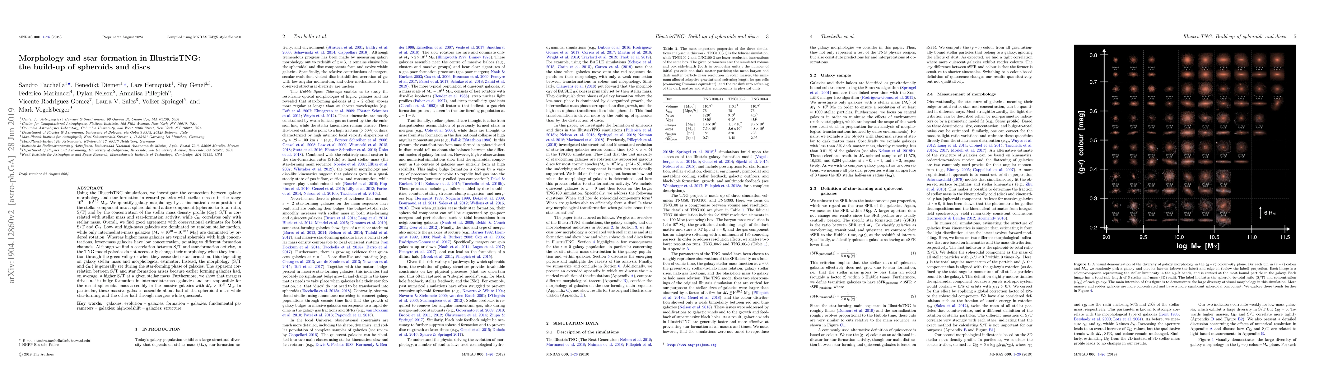 This paper uses IllustrisTNG simulations to explore the relationship between galaxy morphology and star formation, finding that morphology is largely determined during the star-forming phase. The study shows that intermediate-mass galaxies exhibit ordered rotation, while mergers drive bulge formation and spheroidal mass assembly in massive galaxies.