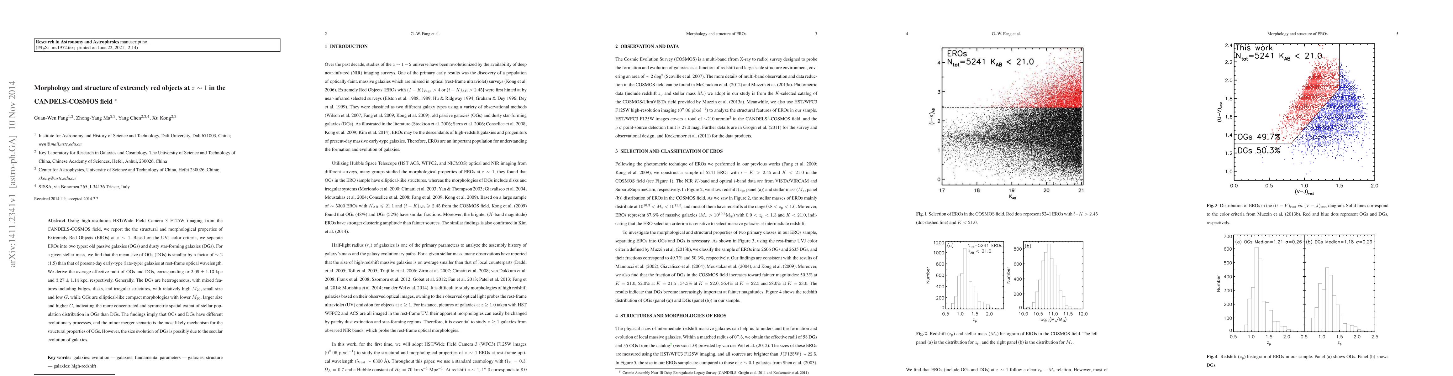 Using high-resolution HST/Wide Field Camera 3 F125W imaging from the CANDELS-COSMOS field, we report the the structural and morphological properties of Extremely Red Objects (EROs) at $z\sim1$. Based on the UVJ color criteria, we separate EROs into two types: old passive galaxies (OGs) and dusty star-forming galaxies (DGs). For a given stellar mass, we find that the mean size of OGs (DGs) is smaller by a factor of $\sim2$ (1.5) than that of present-day early-type (late-type) galaxies at rest-frame optical wavelength. We derive the average effective radii of OGs and DGs, corresponding to $2.09\pm1.13$ kpc and $3.27\pm1.14$ kpc, respectively. Generally, The DGs are heterogeneous, with mixed features including bulges, disks, and irregular structures, with relatively high $M_{\rm 20}$, small size and low $G$, while OGs are elliptical-like compact morphologies with lower $M_{\rm 20}$, larger size and higher $G$, indicating the more concentrated and symmetric spatial extent of stellar population distribution in OGs than DGs. The findings imply that OGs and DGs have different evolutionary processes, and the minor merger scenario is the most likely mechanism for the structural properties of OGs. However, the size evolution of DGs is possibly due to the secular evolution of galaxies.