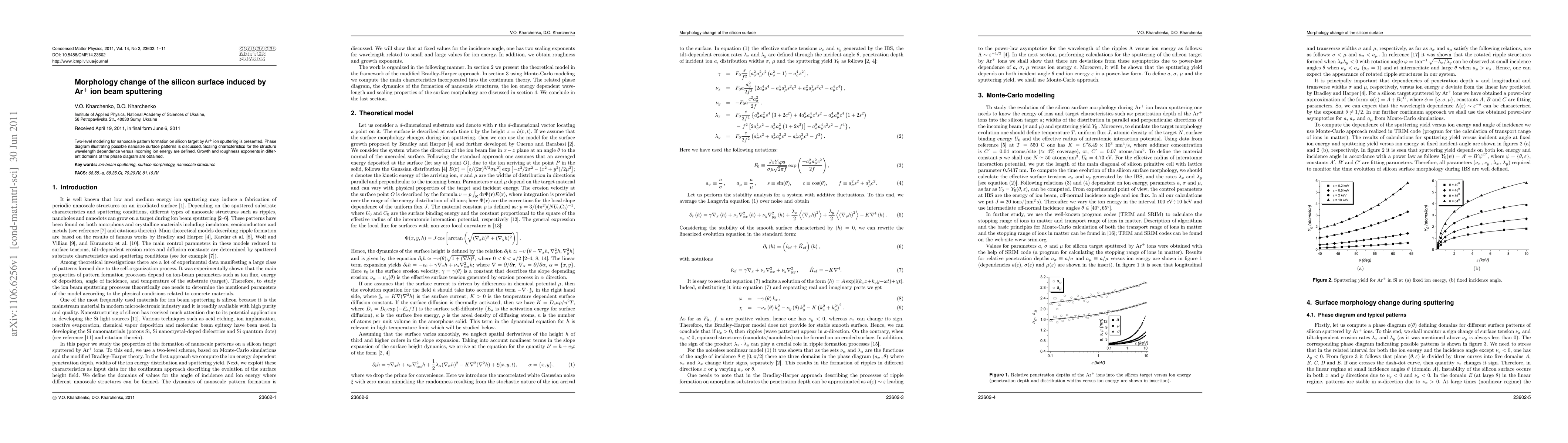 This paper presents a two-level model for nanoscale pattern formation on silicon surfaces via Ar$^+$ ion sputtering, detailing the phase diagram of potential nanosize surface patterns and defining scaling characteristics for structure wavelength dependence relative to ion energy, along with growth and roughness exponents across various phase diagram domains.