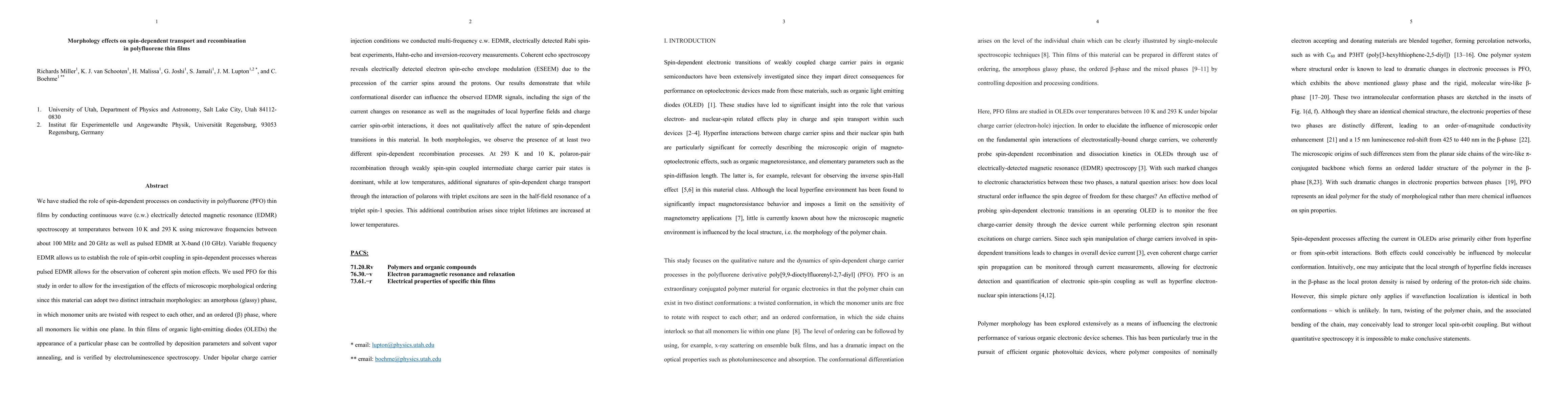 We have studied the role of spin-dependent processes on conductivity in polyfluorene (PFO) thin films by conducting continuous wave (c.w.) electrically detected magnetic resonance (EDMR) spectroscopy at temperatures between 10 K and 293 K using microwave frequencies between about 100 MHz and 20 GHz as well as pulsed EDMR at X-band. Variable frequency EDMR allows us to establish the role of spin-orbit coupling in spin-dependent processes, pulsed EDMR probes coherent spin motion effects. We used PFO for this study in order to allow for the investigation of the effects of microscopic morphological ordering since this material can adopt two distinct intrachain morphologies: an amorphous (glassy) phase, and an ordered (beta) phase. In thin films of organic light-emitting diodes (OLEDs) the appearance of a particular phase can be controlled by deposition parameters, and is verified by electroluminescence spectroscopy. We conducted multi-frequency c.w. EDMR, electrically detected Rabi spinbeat experiments, Hahn-echo and inversion-recovery measurements. Coherent echo spectroscopy reveals electrically detected electron spin-echo envelope modulation (ESEEM) due to the precession of the carrier spins around the protons. Our results demonstrate that while conformational disorder can influence the observed EDMR signals, including the sign of the current changes on resonance as well as the magnitudes of local hyperfine fields and charge carrier spin-orbit interactions, it does not qualitatively affect the nature of spin-dependent transitions in this material. At 293 K and 10 K, polaron-pair recombination through weakly spin-spin coupled intermediate charge carrier pair states is dominant, while at low temperatures, additional signatures of spin-dependent charge transport through the interaction of polarons with triplet excitons are seen in the half-field resonance of a triplet spin-1 species.