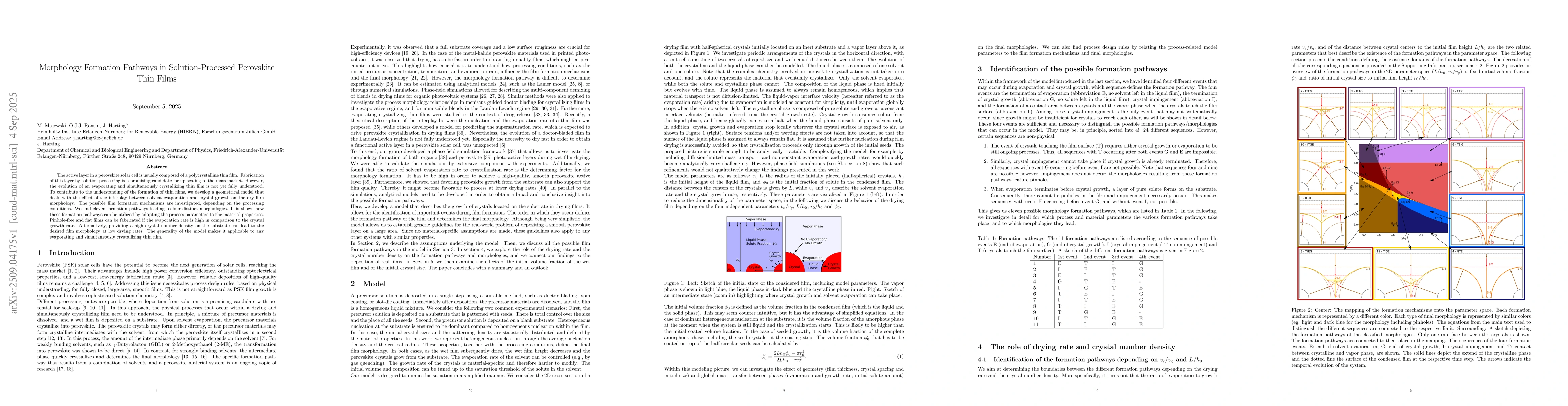 The active layer in a perovskite solar cell is usually composed of a polycrystalline thin film. Fabrication of this layer by solution processing is a promising candidate for up-scaling to the mass market. However, the evolution of an evaporating and simultaneously crystallizing thin film is not yet fully understood. To contribute to the understanding of the formation of thin films, we develop a geometrical model that deals with the effect of the interplay between solvent evaporation and crystal growth on the dry film morphology. The possible film formation mechanisms are investigated, depending on the processing conditions. We find eleven formation pathways leading to four distinct morphologies. It is shown how these formation pathways can be utilized by adapting the process parameters to the material properties. Pinhole-free and flat films can be fabricated if the evaporation rate is high in comparison to the crystal growth rate. Alternatively, providing a high crystal number density on the substrate can lead to the desired film morphology at low drying rates. The generality of the model makes it applicable to any evaporating and simultaneously crystallizing thin film.