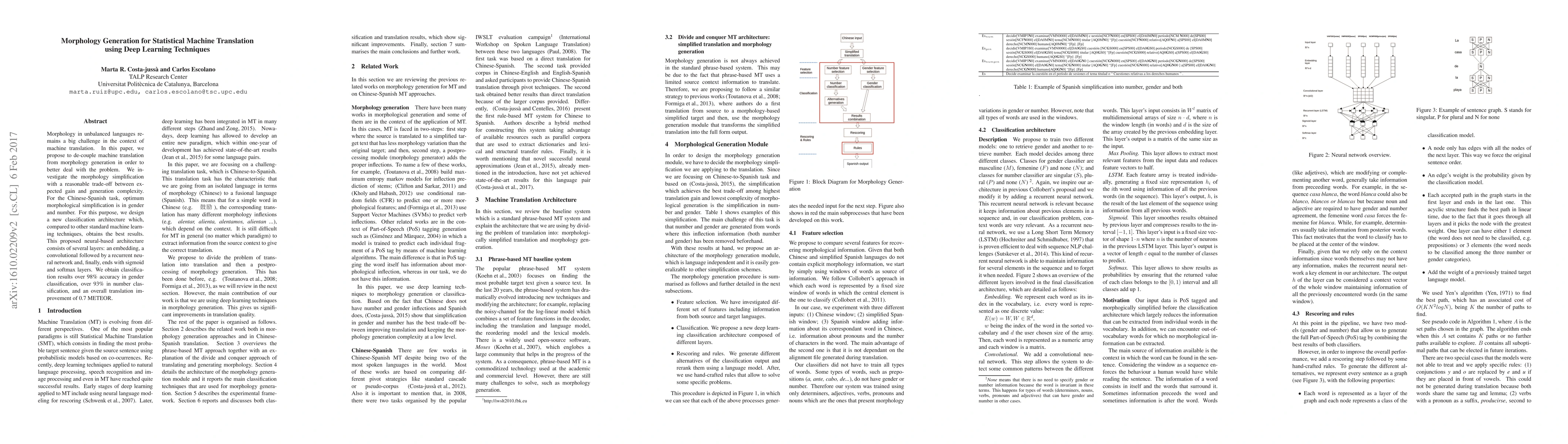 Morphology in unbalanced languages remains a big challenge in the context of machine translation. In this paper, we propose to de-couple machine translation from morphology generation in order to better deal with the problem. We investigate the morphology simplification with a reasonable trade-off between expected gain and generation complexity. For the Chinese-Spanish task, optimum morphological simplification is in gender and number. For this purpose, we design a new classification architecture which, compared to other standard machine learning techniques, obtains the best results. This proposed neural-based architecture consists of several layers: an embedding, a convolutional followed by a recurrent neural network and, finally, ends with sigmoid and softmax layers. We obtain classification results over 98% accuracy in gender classification, over 93% in number classification, and an overall translation improvement of 0.7 METEOR.