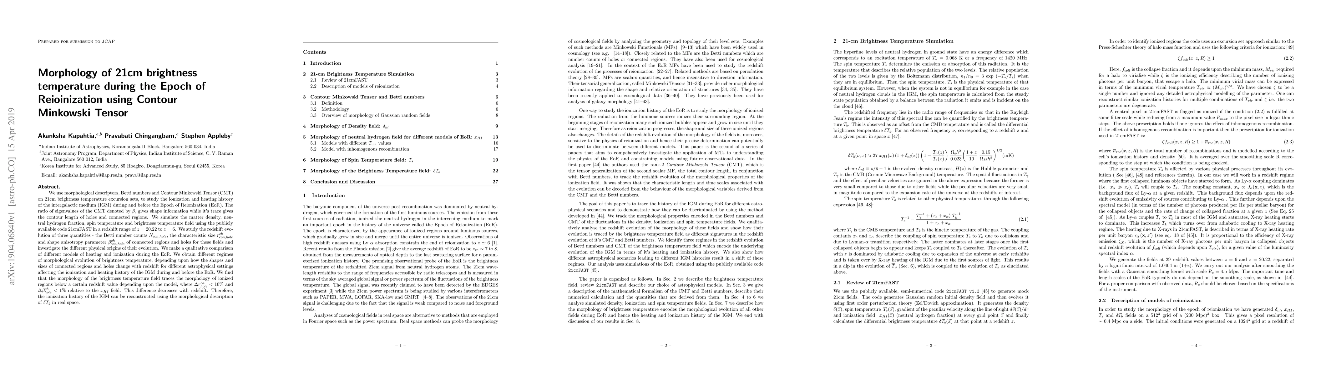 We use morphological descriptors, Betti numbers and Contour Minkowski Tensor (CMT) on 21cm brightness temperature excursion sets, to study the ionization and heating history of the intergalactic medium (IGM) during and before the Epoch of Reionization (EoR). The ratio of eigenvalues of the CMT denoted by $\beta$, gives shape information while it's trace gives the contour length of holes and connected regions. We simulate the matter density, neutral hydrogen fraction, spin temperature and brightness temperature field using the publicly available code 21cmFAST in a redshift range of $z=20.22$ to $z=6$. We study the redshift evolution of three quantities - the Betti number counts $N_{con,hole}$, the characteristic size $r^{ch}_{con,hole}$ and shape anisotropy parameter $\beta^{ch}_{con,hole}$ of connected regions and holes for these fields and investigate the different physical origins of their evolution. We make a qualitative comparison of different models of heating and ionization during the EoR. We obtain different regimes of morphological evolution of brightness temperature, depending upon how the shapes and sizes of connected regions and holes change with redshift for different astrophysical settings affecting the ionization and heating history of the IGM during and before the EoR. We find that the morphology of the brightness temperature field traces the morphology of ionized regions below a certain redshift value depending upon the model, where $\Delta r^{ch}_{hole}<10 \%$ and $\Delta \beta^{ch}_{hole}<1 \%$ relative to the $x_{HI}$ field. This difference decreases with redshift. Therefore, the ionization history of the IGM can be reconstructed using the morphological description of $\delta T_b$ in real space.