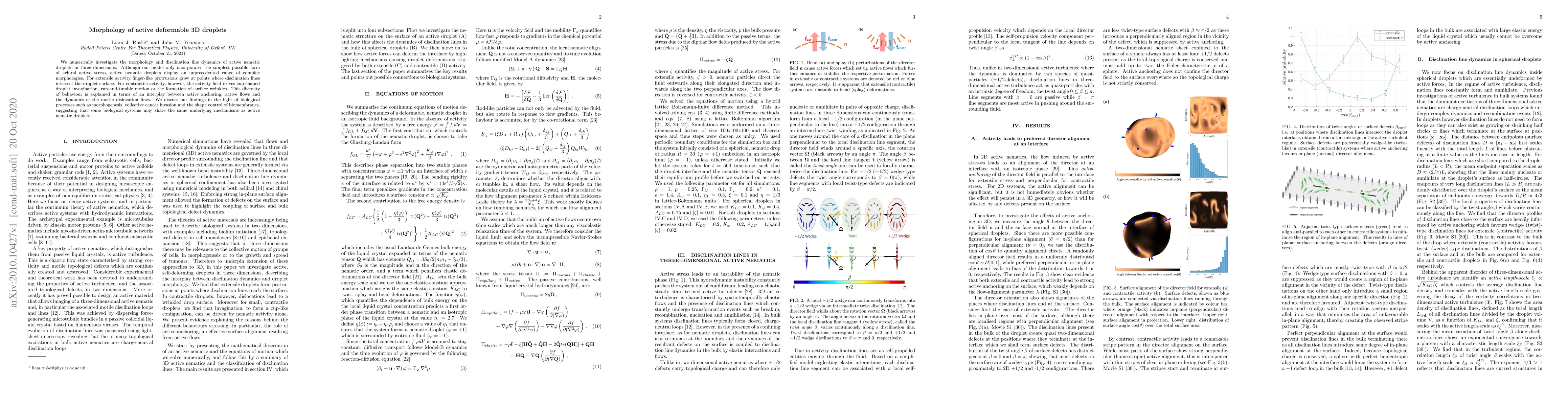 The research numerically investigates the morphology and disclination line dynamics of active nematic droplets in three dimensions using a model that incorporates the simplest form of achiral active stress.