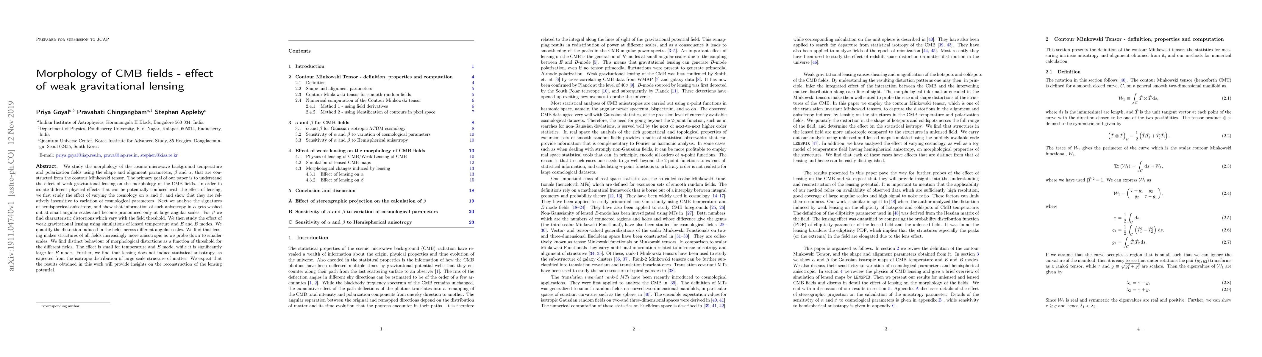 We study the morphology of the cosmic microwave background temperature and polarization fields using the shape and alignment parameters, $\beta$ and $\alpha$, that are constructed from the contour Minkowski tensor. The primary goal of our paper is to understand the effect of weak gravitational lensing on the morphology of the CMB fields. In order to isolate different physical effects that can be potentially confused with the effect of lensing, we first study the effect of varying the cosmology on $\alpha$ and $\beta$, and show that they are relatively insensitive to variation of cosmological parameters. Next we analyze the signatures of hemispherical anisotropy, and show that information of such anisotropy in $\alpha$ gets washed out at small angular scales and become pronounced only at large angular scales. For $\beta$ we find characteristic distortions which vary with the field threshold. We then study the effect of weak gravitational lensing using simulations of lensed temperature and $E$ and $B$ modes. We quantify the distortion induced in the fields across different angular scales. We find that lensing makes structures of all fields increasingly more anisotropic as we probe down to smaller scales. We find distinct behaviour of morphological distortions as a function of threshold for the different fields. The effect is small for temperature and $E$ mode, while it is significantly large for $B$ mode. Further, we find that lensing does not induce statistical anisotropy, as expected from the isotropic distribution of large scale structure of matter. We expect that the results obtained in this work will provide insights on the reconstruction of the lensing potential.