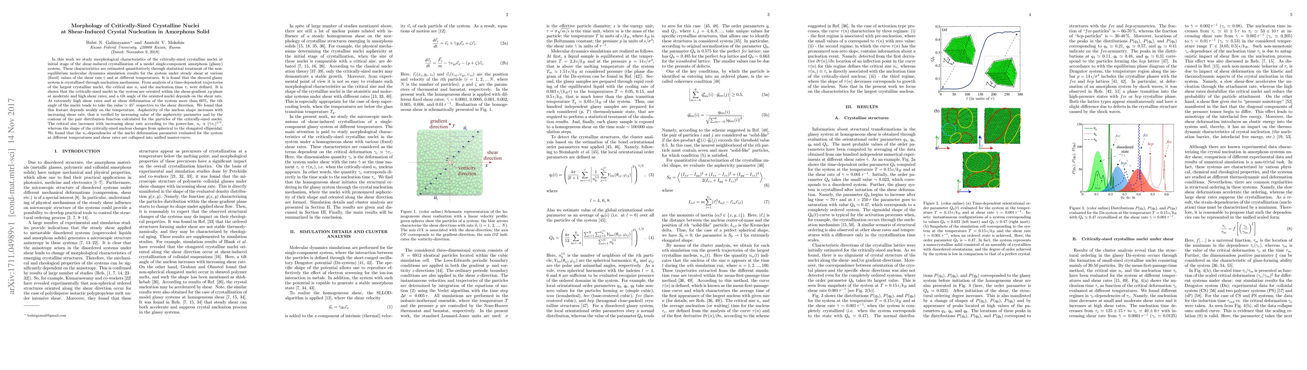 In this work we study morphological characteristics of the critically-sized crystalline nuclei at initial stage of the shear-induced crystallization of a model single-component amorphous (glassy) system. These characteristics are estimated quantitatively through statistical treatment of the non-equilibrium molecular dynamics simulation results for the system under steady shear at various (fixed) values of the shear rate $\dot\gamma$ and at different temperatures. It is found that the sheared glassy system is crystallized through nucleation mechanism. From analysis of a time-dependent trajectories of the largest crystalline nuclei, the critical size $n_{c}$ and the nucleation time $\tau_{c}$ were defined. It is shown that the critically-sized nuclei in the system are oriented within the shear-gradient $xy$-plane at moderate and high shear rates; and a tilt angle of the oriented nuclei depends on the shear rate. At extremely high shear rates and at shear deformation of the system more than $60$\%, the tilt angle of the nuclei tends to take the value $\simeq45^\circ$ respective to the shear direction. We found that this feature depends weakly on the temperature. Asphericity of the nucleus shape increases with increasing shear rate, that is verified by increasing value of the asphericity parameter and by the contour of the pair distribution function calculated for the particles of the critically-sized nuclei. The critical size increases with increasing shear rate according to the power-law, $n_{c}\propto(\dot\gamma\tau_{c})^{1/3}$, whereas the shape of the critically-sized nucleus changes from spherical to the elongated ellipsoidal. We found that the $n_{c}$-dependencies of the nuclei deformation parameter evaluated for the system at different temperatures and shear rates are collapsed into unified master-curve.