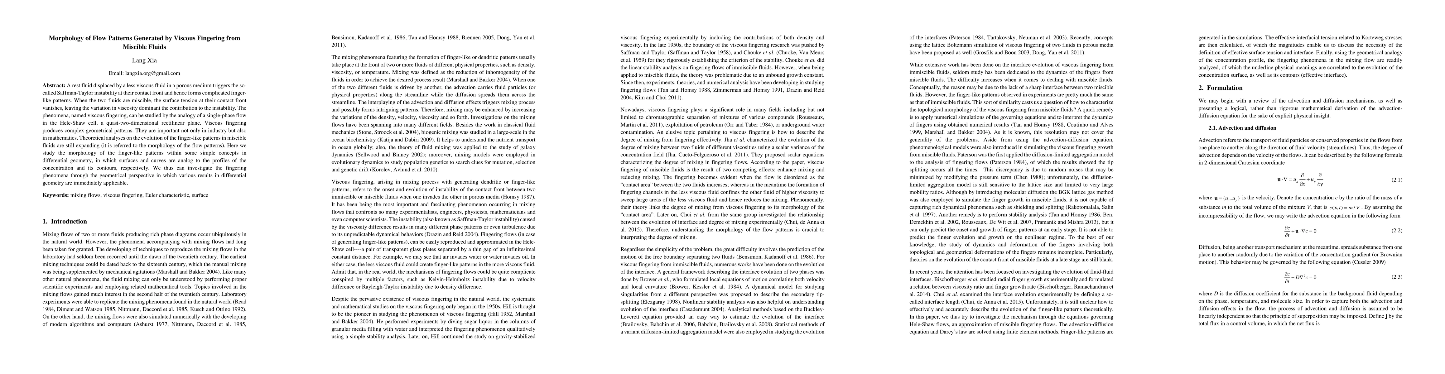 This paper explores the morphology of complex finger-like patterns formed by viscous fingering in miscible fluids using differential geometry. It applies geometric concepts to understand the evolution of these patterns, which are significant in both industrial and mathematical contexts.